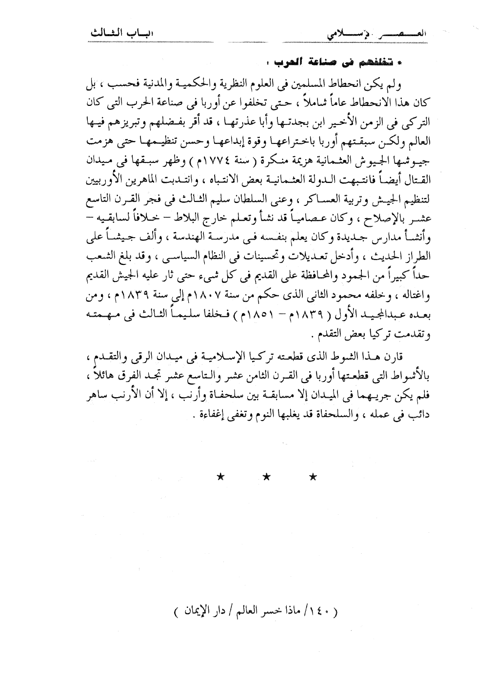 ولم يكن انحطاط المسلمين في العلوم النظرية والحكمية والمدنية فحسب، بل كان هذا الانحطاط عاماً شاملاً، حتى تخلفوا عن أوربا في صناعة الحرب التي كان التركي في الزمن الأخير ابن بجدتها وأبا عذرتها، قد أقرّ بفضلهم وتبريزهم فيها العالم، ولكن سبقتهم أوربا باختراعها وقوة إبداعها وحسن تنظيمها حتى هزمت جيوشها الجيوش العثمانية هزيمة منكرة (سنة 1774م) وظهر سبقها في ميدان القتال أيضاً فانتبهت الدولة العثمانية بعض الانتباه، وانتدبت الماهرين الأوربيين لتنظيم الجيش وتربية العساكر، وعُني السلطان سليم الثالث في فجر القرن التاسع عشر بالإصلاح، وكان عصامياً قد نشأ وتعلم خارج البلاط- خلافاً