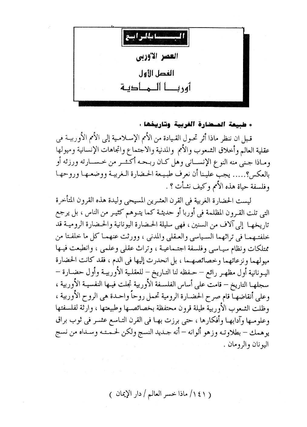 قبل أن ننظر ماذا أثّر تحول القيادة من الأمم الإسلامية إلى الأمم الأوربية في عقلية العالم وأخلاق الشعوب والأمم والمدنية والاجتماع واتجاهات الإنسانية وميولها، وماذا جنى منه النوع الإنساني، وهل كان ربحه أكثر من خسارته ورزئه أو بالعكس؟ .. يجب علينا أن نعرف طبيعة الحضارة الغربية ووضعها وروحها وفلسفة حياة هذه الأمم وكيف نشأت؟