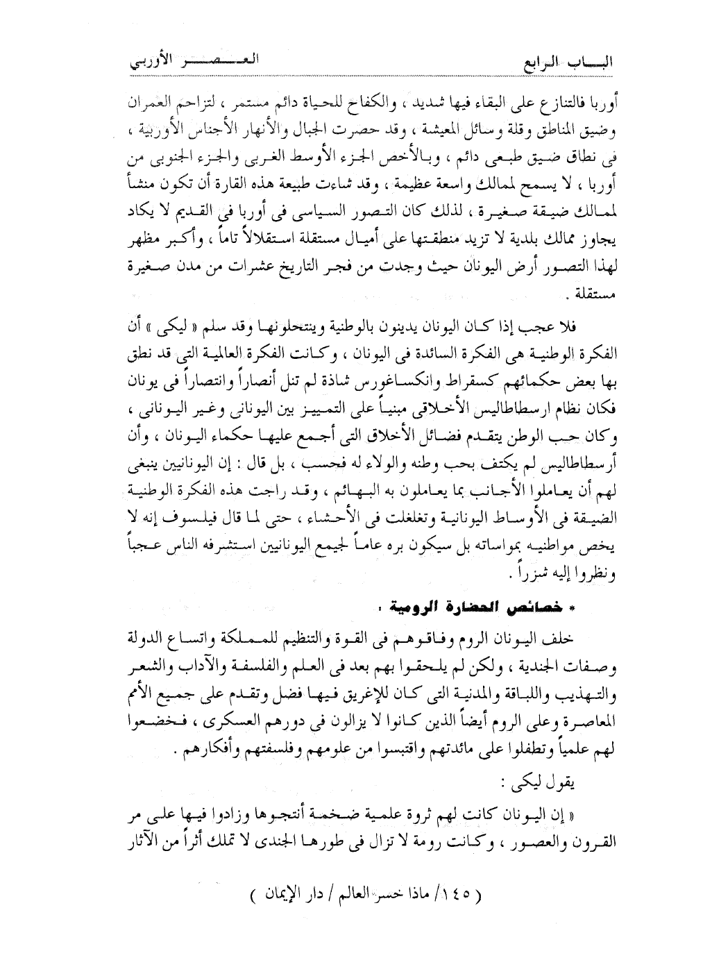 ((إن اليونان كانت لهم ثروة علمية ضخمة أنتجوها وزادوا فيها على مر القرون والعصور، وكانت رومة لا تزال في طورها الجندي لا تملك أثراً من الآثار