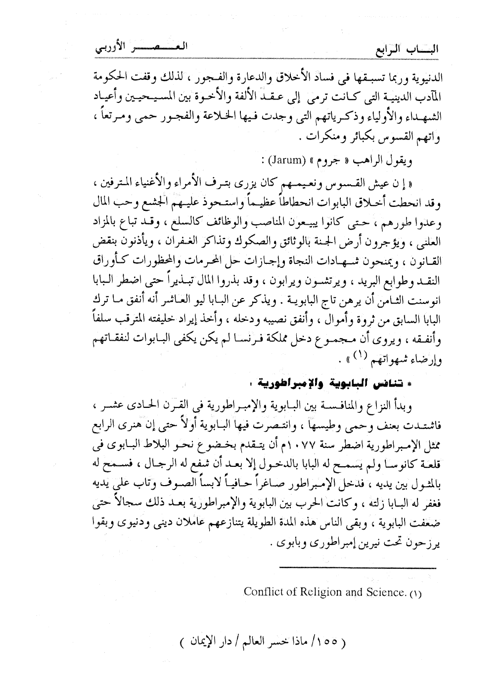 ((إن عيش القسوس ونعيمهم كان يزري بترف الأمراء والأغنياء المترفين، وقد انحطت أخلاق البابوات انحطاطاً عظيماً واستحوذ عليهم الجشع وحب المال وعدوا طورهم، حتى كانوا يبيعون المناصب والوظائف كالسلع، وقد تباع بالمزاد العلني، ويؤجرون أرض الجنة