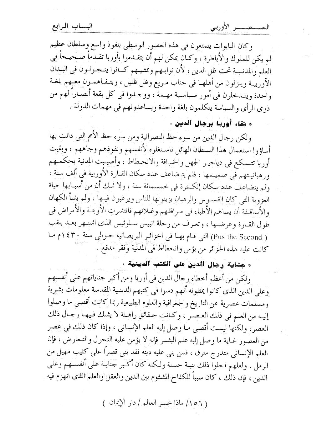 ولكن من أعظم أخطاء رجال الدين في أوربا ومن أكبر جناياتهم على أنفسهم وعلى الدين الذي كانوا يمثلونه أنهم دسوا في كتبهم الدينية المقدسة معلومات بشرية ومسلمات عصرية عن التاريخ والجغرافية والعلوم الطبيعية ربما كانت أقصى ما وصلوا إليه من العلم في ذلك العصر، وكانت حقائق راهنة لا يشك فيها رجال ذلك العصر، ولكنها ليست أقصى ما وصل إليه العلم الإنساني، وإذا كان ذلك في عصر من العصور غاية ما وصل إليه علم البشر فإنه لا يؤمن عليه التحول والتعارض؛ فإن العلم الإنساني متدرج مترق، فمن بنى عليه دينه فقد بنى قصرًا على كثيب مهيل من الرمل. ولعلهم فعلوا ذلك بنية حسنة ولكنه كان أكبر جناية على أنفسهم وعلى الدين، فإن ذلك، كان سبباً للكفاح المشئوم بين الدين والعقل والعلم الذي انهزم فيه