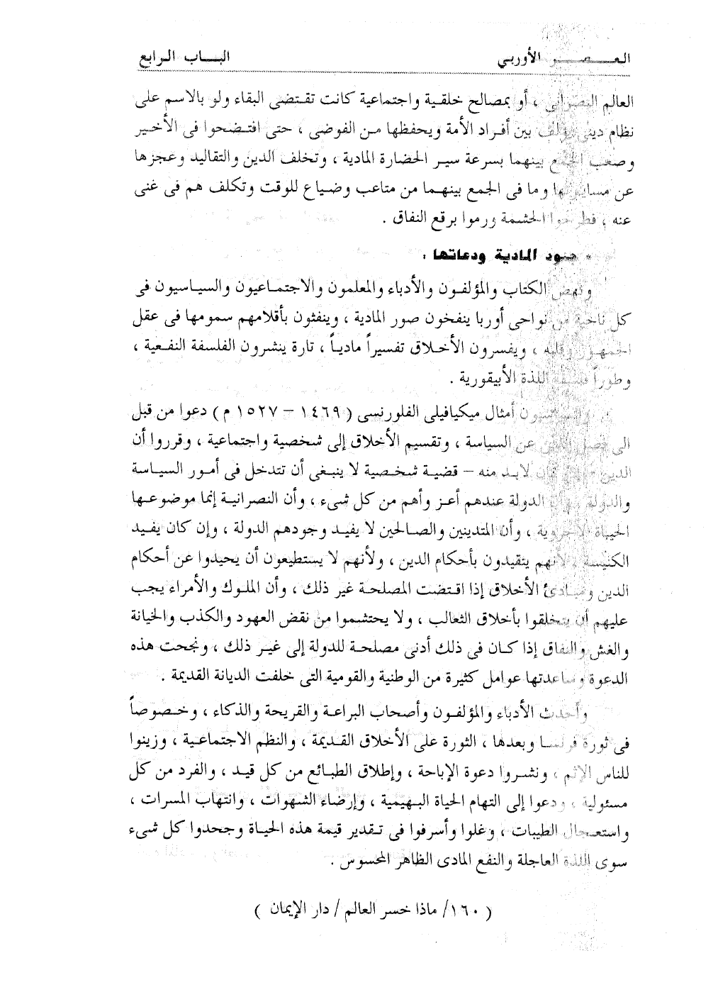 العالم النصراني، أو بمصالح خلقية واجتماعية كانت تقتضي البقاء ولو بالاسم على نظام ديني يؤلف بين أفراد الأمة ويحفظها من الفوضى، حتى افتضحوا في الأخير وصعب الجمع بينهما بسرعة سير الحضارة المادية، وتخلف الدين والتقاليد وعجزها عن مسايرتها وما في الجمع بينهما من متاعب وضياع للوقت وتكلف هم في غني عنه، فطرحوا الحشمة ورموا برقع النفاق.