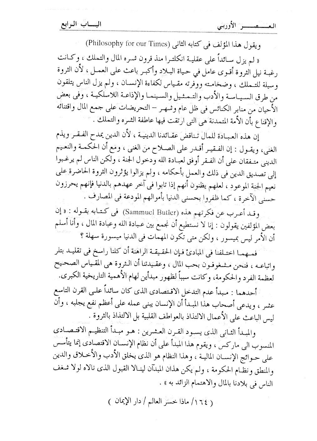 وقد أعرب عن فكرتهم هذه (Sammuel Butler) في كتابه بقوله: ((إن بعض المؤلفين يقولون: إنا لا نستطيع أن نجمع بين عبادة الله وعبادة المال، وأنا أسلم أن الأمر ليس بميسور، ولكن متى تكون المهمات في الدنيا ميسورة سهلة؟