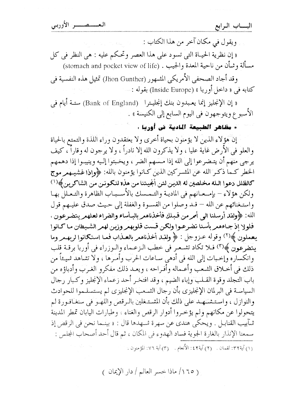 وإخبات إلى الله في أدهى ساعات الحرب وأمرِّها، ولا تشاهد شيئاً من ذلك في أخلاق الشعب وأعماله وأفراحه، ويعد ذلك مفكرو الغرب وأدباؤه من باب التجلد وقوة القلب وإباء الضيم، وقد افتخر أحد زعماء الإنجليز وكبار رجال السياسة في البرلمان الإنجليزي بأن رجال الشعب الإنجليزي لم يستسلموا للحوادث والنوازل، واستشهد على ذلك بأن المشتغلين بالرقص واللهو في سنغافورة لم يتحولوا عن مكانهم ولم يؤخروا أدوار الرقص والغناء، وطيارات اليابان تمطر المدينة شآبيب القنابل. ويحكي هندي عن سهرة شهدها قال: ((بينما نحن في الرقص إذ سمعنا الإنذار بالغارة الجوية فساد الهدوء في المكان، ثم قال أحد أصحاب المجلس:
