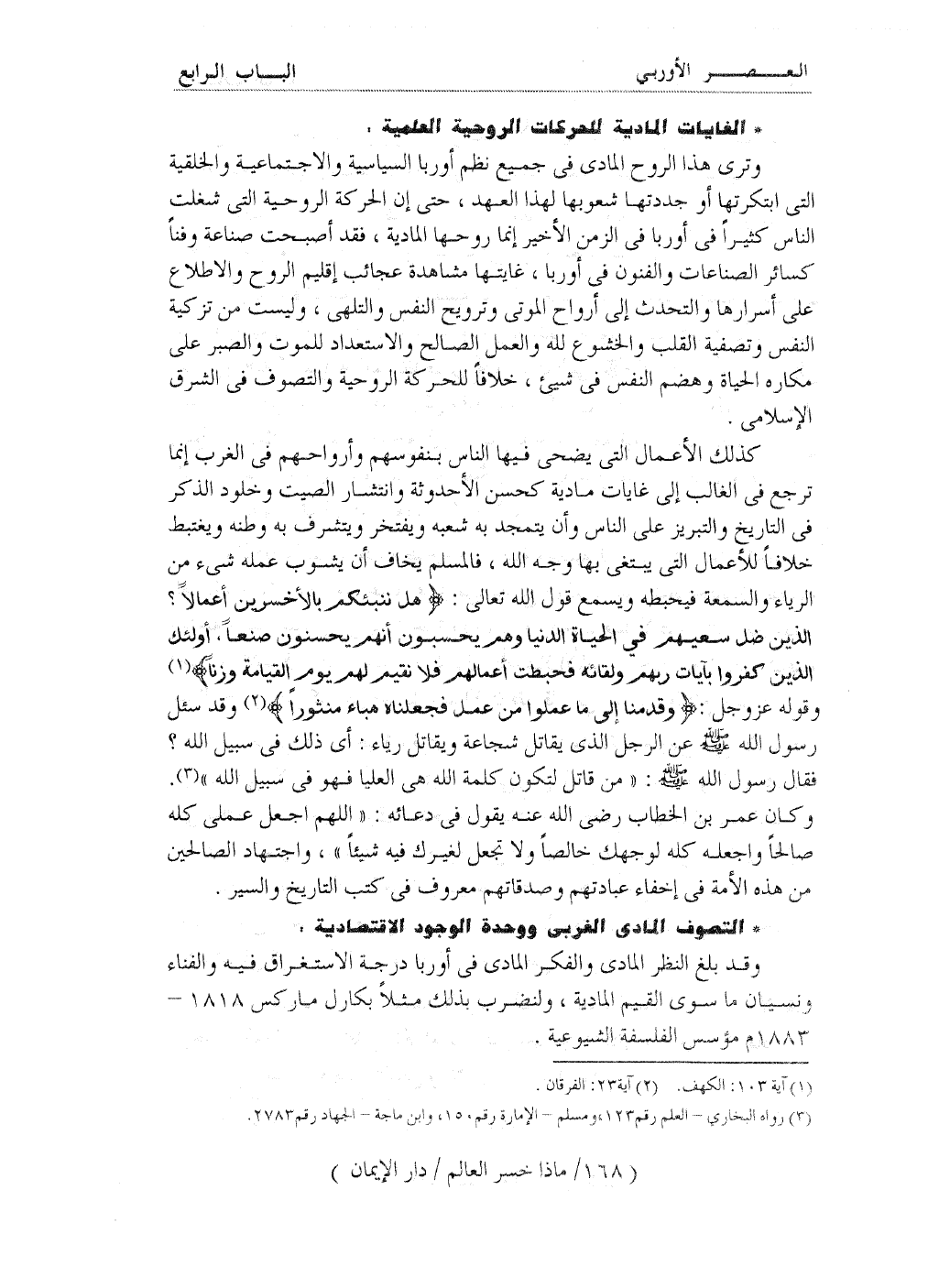 وقد بلغ النظر المادي والفكر المادي في أوربا درجة الاستغراق فيه والفناء ونسيان ما سوى القيم المادية، ولنضرب بذلك مثلاً بكارل ماركس 1818 - 1883 م مؤسس الفلسفة الشيوعية.
