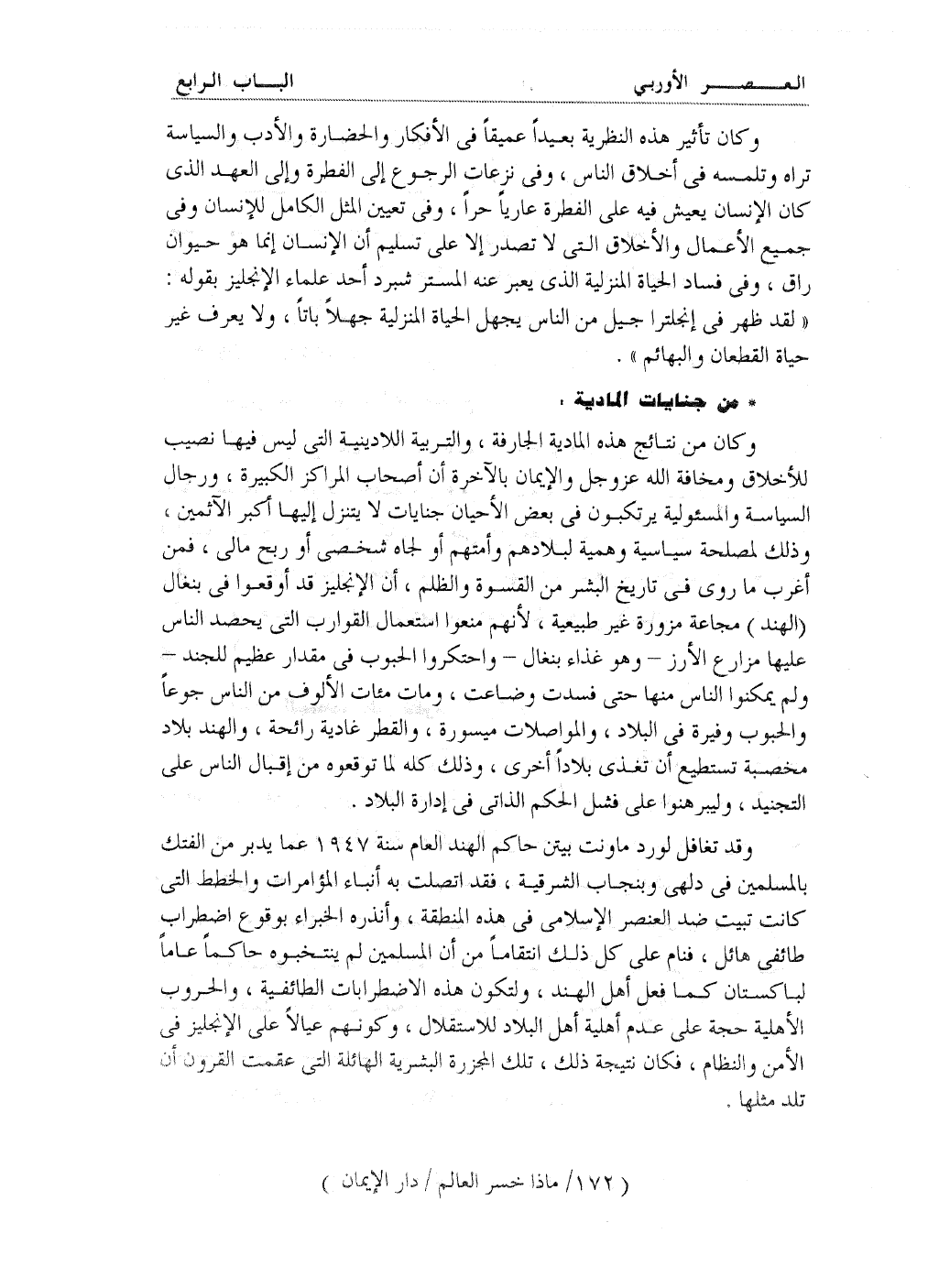 والمسئولية يرتكبون في بعض الأحيان جنايات لا يتنزل إليها أكبر الآثمين. وذلك لمصلحة سياسية وهمية لبلادهم وأمتهم أو لجاه شخصي أو ربح مالي، فمن أغرب ما روي في تاريخ البشر من القسوة والظلم، أن الإنجليز قد أوقعوا في بنغال (الهند) مجاعة مزورة غير طبيعية، لأنهم منعوا استعمال القوارب التي يحصد الناس عليها مزارع الأرز - وهو غذاء بنغال - واحتكروا الحبوب في مقدار عظيم للجند، ولم يمكنوا الناس منها حتى فسدت وضاعت، ومات مئات الألوف من الناس جوعاً، والحبوب وفيرة في البلاد، والمواصلات ميسورة، والقطر غادية رائحة، والهند بلاد مخصبة تستطيع أن تغذي بلاداً أخرى. وذلك كله لما توقعوه من إقبال الناس على التجنيد , وليرهنوا على فشل الحكم الذاتي في إدارة البلاد.