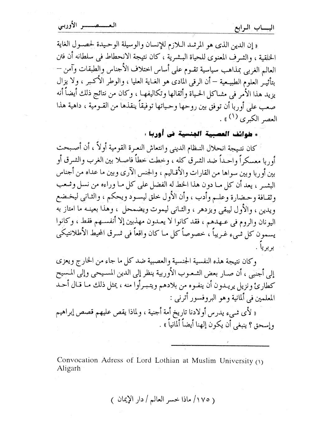 ((إن الدين الذي هو المرشد اللازم للإنسان والوسيلة الوحيدة لحصول الغاية الخلقية، والشرف المعنوي للحياة البشرية، كان نتيجة الانحطاط في سلطانه أن فتن العالم الغربي بمذاهب سياسية تقوم على أساس اختلاف الأجناس والطبقات وآمن - بتأثير العلوم الطبيعية- أن الرقي المادي هو الغاية العليا، والوطر الأكبر، ولا يزال يزيد هذا الأمر في مشاكل الحياة وأثقالها وتكاليفها، وكان من نتائج ذلك أيضاً أنه صعب على أوربا أن توفق بين روحها وحياتها توفيقاً ينقذها من القومية، داهية هذا العصر الكبرى (¬1)) .