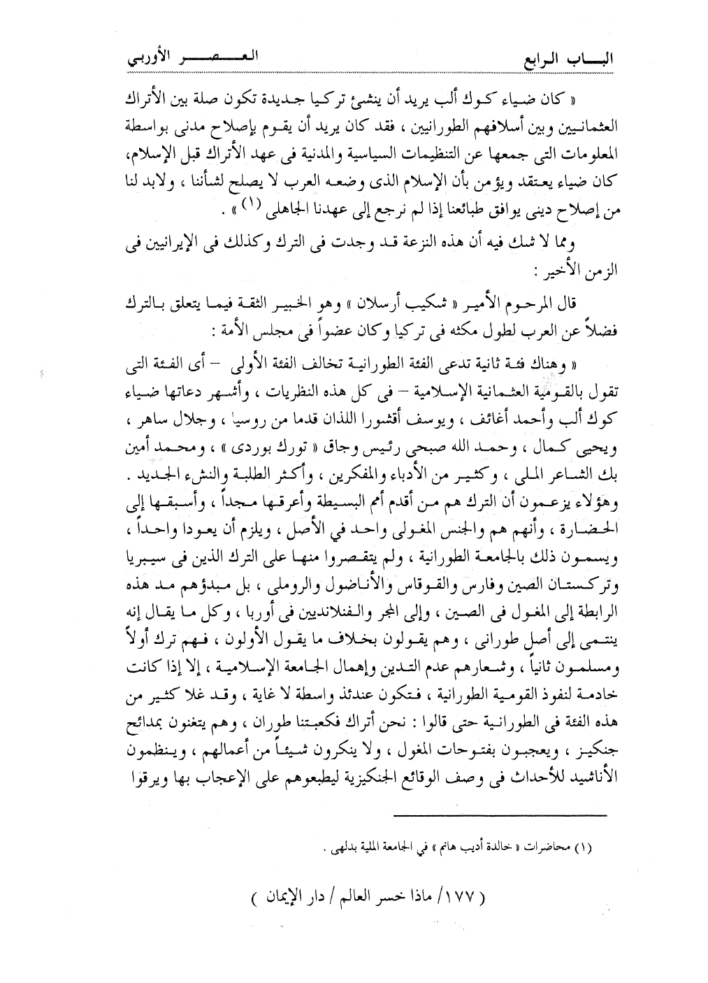 ((وهناك فئة ثانية تدعى الفئة الطورانية تخالف الفئة الأولى، - أي الفئة التي تقول بالقومية العثمانية الإسلامية - في كل هذه النظريات، وأشهر دعاتها ضياء كوك ألب وأحمد أغائف، ويوسف أقشورا اللذان قدما من روسيا، وجلال ساهر، ويحي كمال، وحمدالله صبحي رئيس وجاق ((تورك بوردي)) ومحمد أمين بك الشاعر الملي، وكثير من الأدباء والمفكرين، وأكثر الطلبة والنشء الجديد. وهؤلاء يزعمون أن الترك هم من أقدم أمم البسيطة وأعرقها مجداً، وأسبقها إلى الحضارة، وأنهم هم والجنس المغولي واحد في الأصل، ويلزم أن يعودا واحداً، ويسمون ذلك بالجامعة الطورانية، ولم يقتصروا منها على الترك الذين في سيبريا وتركستان الصين وفارس والقوقاس والأناضول والروملي، بل مبدؤهم مد هذه الرابطة إلى المغول في الصين، وإلى المجر والفنلانديين في أوربا، وكل ما يقال إنه ينتمي إلى أصل طوراني، وهم يقولون بخلاف ما يقول الأولون، فهم ترك أولاً ومسلمون ثانياً، وشعارهم عدم التدين وإهمال الجامعة الإسلامية، إلا إذا كانت خادمة لنفوذ القومية الطورانية