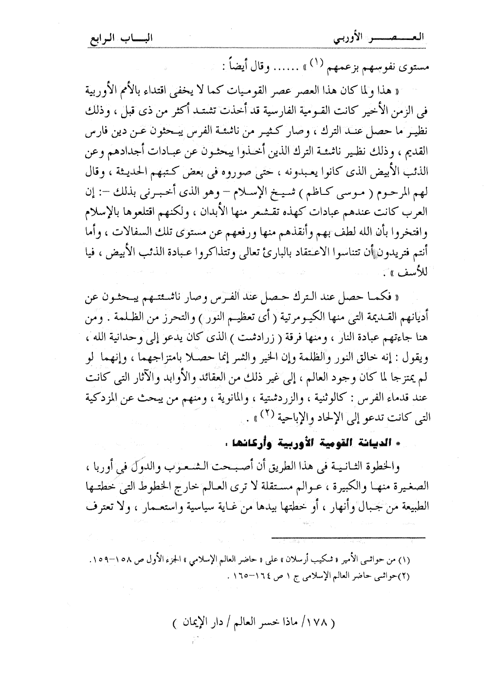 ((فكما حصل عند الترك حصل عند الفرس وصار ناشئتهم يبحثون عن أديانهم القديمة التي منها الكيومرتية (أي تعظيم النور) والتحرز من الظلمة. ومن هنا جاءتهم عبادة النار، ومنها فرقة (زرادشت) الذي كان يدعو إلى وحدانية الله، ويقول: إنه خالق النور والظلمة وإن الخير والشر إنما حصلا بامتزاجهما، وإنهما لو لم يمتزجا لما كان وجود للعالم، إلى غير ذلك من العقائد والأوابد والآثار التي كانت عند قدماء الفرس: كالثنوية، والزردشتية، والمانوية، ومنهم من يبحث عن المزدكية التي كانت تدعو إلى الإلحاد والإباحية (¬2)) .