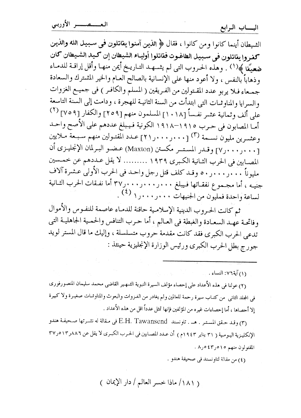 الشيطان أينما كانوا ومن كانوا، فقال: {الَّذِينَ آمَنُواْ يُقَاتِلُونَ فِي سَبِيلِ اللهِ وَالَّذِينَ كَفَرُواْ يُقَاتِلُونَ فِي سَبِيلِ الطَّاغُوتِ فَقَاتِلُواْ أَوْلِيَاء الشَّيْطَانِ إِنَّ كَيْدَ الشَّيْطَانِ كَانَ ضَعِيفاً} . وهذه الحروب التي لم يشهد التاريخ أيمن منها وأقل إراقة للدماء وذهاباً بالنفس، ولا أعود منها على الإنسانية بالصالح العام والخير المشترك والسعادة جمعاء فلا يربو عدد المقتولين من الفريقين (المسلم والكافر) في جميع الغزوات والسرايا والمناوشات التي ابتدأت من السنة الثانية للهجرة، ودامت إلى السنة التاسعة على ألف وثمانية عشر نفساً 1018 المسلمون منهم 259 والكفار 759 (¬1) أما المصابون في حرب 1914 - 1918 الكونية فيبلغ عددهم على الأصح واحداً وعشرين مليون نسمة (¬2) 000,000, 21 عدد المقتولين منهم سبعة ملايين 000 ,00, 7 وقدر المستر مكستن (Maxton) عضو البرلمان الإنجليزي أن المصابين في الحرب الثانية الكبرى 1939.... لا يقل عددهم عن خمسين مليون 000 ,000, 50 وقد كلف قتل رجل واحد في الحرب الأولى عشرة آلاف جنيه، أما مجموع نفقاتها فيبلغ 000,000,000,37 جنيه أما نفقات الحرب الثانية لساعة واحدة فمليون من الجنيهات 000,000,1 (¬3) .