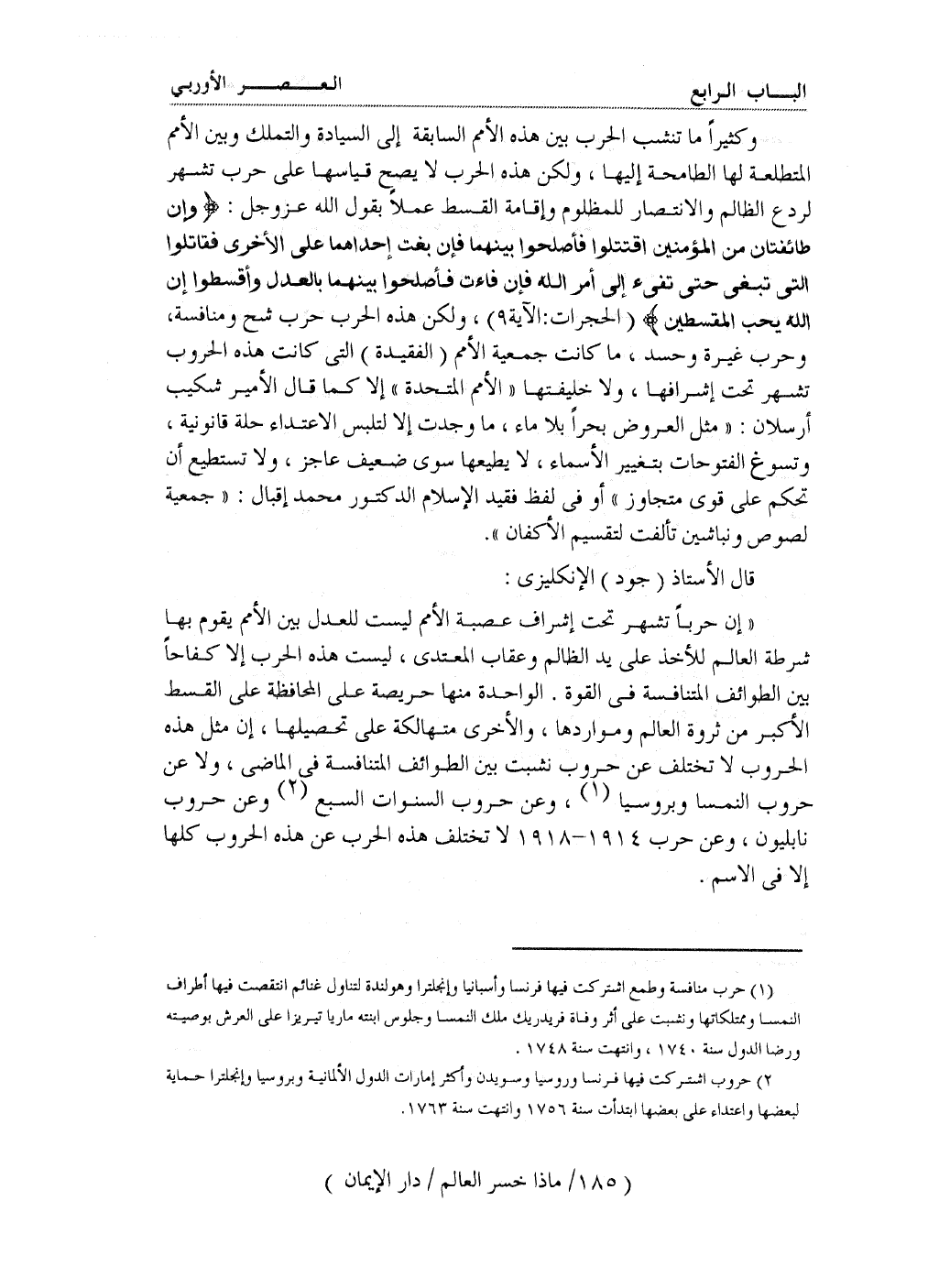 وكثيراً ما تنشب الحرب بين هذه الأمم السابقة إلى السيادة والتملك وبين الأمم المتطلعة لها الطامحة إليها، ولكن هذه الحرب لا يصح قياسها على حرب تشهر لردع الظالم والانتصار للمظلوم وإقامة القسط عملاً بقول الله عز وجل: {وَإِن طَائِفَتَانِ مِنَ الْمُؤْمِنِينَ اقْتَتَلُوا فَأَصْلِحُوا بَيْنَهُمَا فَإِن بَغَتْ إِحْدَاهُمَا عَلَى الْأُخْرَى فَقَاتِلُوا الَّتِي تَبْغِي حَتَّى تَفِيءَ إِلَى أَمْرِ اللَّهِ فَإِن فَاءتْ فَأَصْلِحُوا بَيْنَهُمَا بِالْعَدْلِ وَأَقْسِطُوا إِنَّ اللَّهَ يُحِبُّ الْمُقْسِطِينَ} (الحجرات) ، ولكن هذه الحرب حرب شح ومنافسة، وحرب غيرة وحسد، ما كانت جمعية الأمم (الفقيدة) التي كانت هذه الحروب تشهر تحت إشرافها، ولا خليفتها الأمم المتحدة)) إلا كما قال الأمير شكيب أرسلان: ((مثل العروض بحراً بلا ماء، ما وجدت إلا لتلبس الاعتداء حلة قانونية، وتسوغ الفتوحات بتغيير الأسماء، لا يطيعها سوى ضعيف عاجز، ولا تستطيع أن تحكم على قوي متجاوز)) أو في لفظ فقيد الإسلام الدكتور محمد إقبال: ((جمعية لصوص ونباشين تألفت لتقسيم الأكفان)) .
