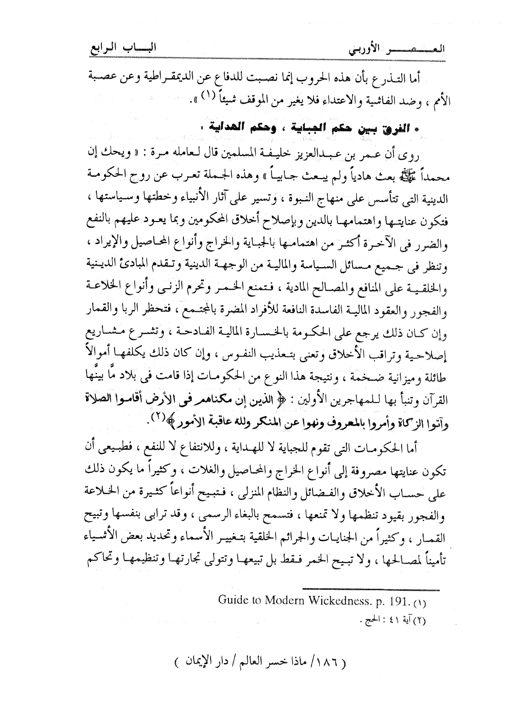 أما الحكومات التي تقوم للجباية لا للهداية، وللانتفاع لا للنفع، فطبيعي أن تكون عنايتها مصروفة إلى أنواع الخراج والمحاصيل والغلات، وكثيراً ما يكون ذلك على حساب الأخلاق والفضائل والنظام المنزلي، فتبيح أنواعاً كثيرة من الخلاعة والفجور بقيود تنظمها ولا تمنعها، فتسمح بالبغاء الرسمي، وقد ترابي نفسها وتبيح القمار، وكثيراً من الجنايات