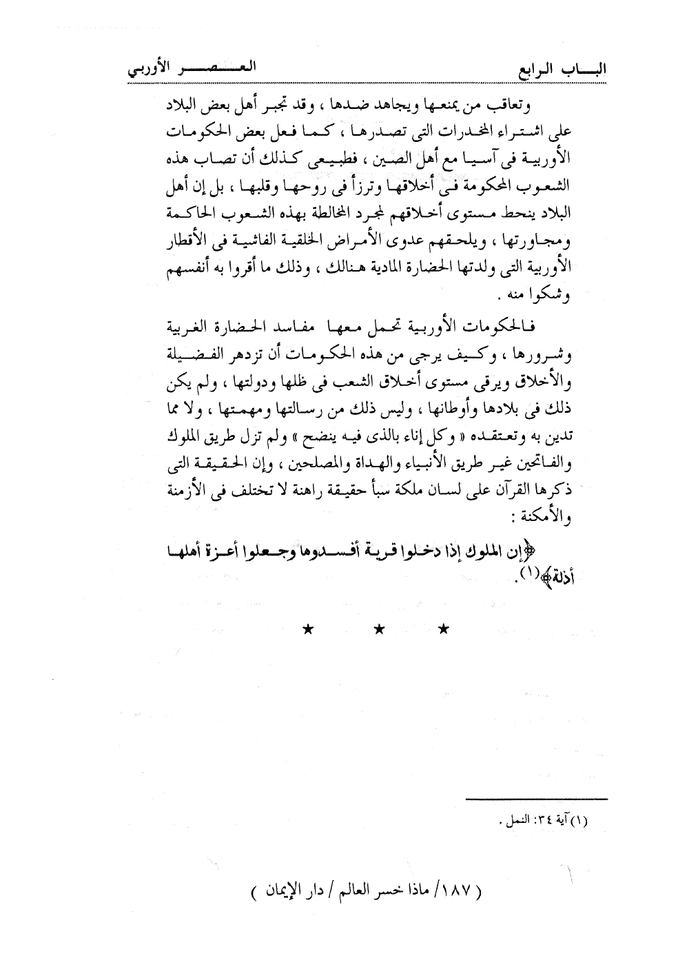 فالحكومات الأوربية تحمل معها مفاسد الحضارة الغربية وشرورها، وكيف يرجى من هذه الحكومات أن تزدهر الفضيلة والأخلاق ويرقى مستوى أخلاق الشعب في ظلها ودولتها، ولم يكن ذلك في بلادها وأوطانها، وليس ذلك من رسالتها ومهمتها، ولا مما تدين به وتعتقده ((وكل إناء بالذي فيه ينضح)) ولم تزل طريق الملوك والفاتحين غير طريق الأنبياء والهداة والمصلحين، وإن الحقيقة التي ذكرها القرآن على لسان ملكة سبأ حقيقة راهنة لا تختلف في الأزمنة والأمكنة:
