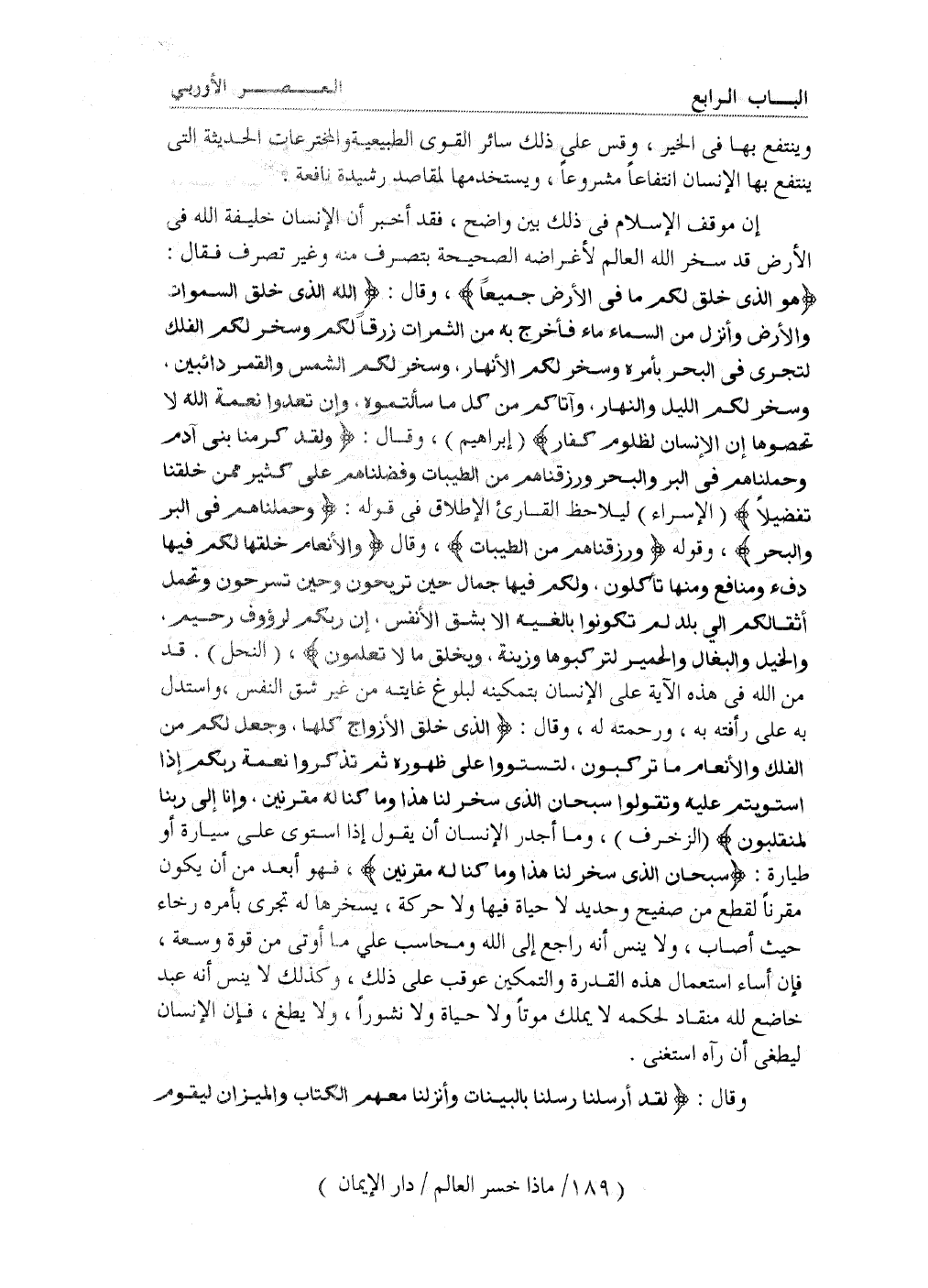 إن موقف الإسلام في ذلك بيِّن واضح، فقد أخبر أن الإنسان خليفة الله في الأرض قد سخر الله العالم لأغراضه الصحيحة بتصرف منه وغير تصرف فقال: {هُوَ الَّذِي خَلَقَ لَكُم مَّا فِي الأَرْضِ جَمِيعاً} ، وقال: {اللهُ الَّذِي خَلَقَ السَّمَاوَاتِ وَالأَرْضَ وَأَنزَلَ مِنَ السَّمَاءِ مَاءً فَأَخْرَجَ بِهِ مِنَ الثَّمَرَاتِ رِزْقاً لَّكُمْ وَسَخَّرَ لَكُمُ الْفُلْكَ لِتَجْرِيَ فِي الْبَحْرِ بِأَمْرِهِ وَسَخَّرَ لَكُمُ الأَنْهَارَ {32} وَسَخَّر لَكُمُ الشَّمْسَ وَالْقَمَرَ دَآئِبَينَ وَسَخَّرَ لَكُمُ اللَّيْلَ وَالنَّهَارَ {33} وَآتَاكُم مِّن كُلِّ مَا سَأَلْتُمُوهُ وَإِن تَعُدُّواْ نِعْمَتَ اللهِ لاَ تُحْصُوهَا إِنَّ الإِنسَانَ لَظَلُومٌ كَفَّارٌ} (إبراهيم) ، وقال: {وَلَقَدْ كَرَّمْنَا بَنِي آدَمَ وَحَمَلْنَاهُمْ فِي الْبَرِّ وَالْبَحْرِ وَرَزَقْنَاهُم مِّنَ الطَّيِّبَاتِ وَفَضَّلْنَاهُمْ عَلَى كَثِيرٍ مِّمَّنْ خَلَقْنَا تَفْضِيلاً} (الإسراء) ليلاحظ القارئ الإطلاق في قوله: {وَحَمَلْنَاهُمْ فِي الْبَرِّ وَالْبَحْرِ} ، وقوله: {وَرَزَقْنَاهُم مِّنَ الطَّيِّبَاتِ} ، وقال: {وَالأَنْعَامَ خَلَقَهَا لَكُمْ فِيهَا دِفْءٌ وَمَنَافِعُ وَمِنْهَا تَأْكُلُونَ {5} وَلَكُمْ فِيهَا جَمَالٌ حِينَ تُرِيحُونَ وَحِينَ تَسْرَحُونَ {6} وَتَحْمِلُ أَثْقَالَكُمْ إِلَى بَلَدٍ لَّمْ تَكُونُواْ بَالِغِيهِ إِلاَّ بِشِقِّ الأَنفُسِ إِنَّ رَبَّكُمْ لَرَؤُوفٌ رَّحِيمٌ {7} وَالْخَيْلَ وَالْبِغَالَ وَالْحَمِيرَ لِتَرْكَبُوهَا وَزِينَةً وَيَخْلُقُ مَا لاَ تَعْلَمُونَ} (النحل) . قد منَّ الله في هذه الآية على الإنسان بتمكينه لبلوغ غايته من غير شق النفس، واستدل به على رأفته به، ورحمته له، وقال: {وَالَّذِي خَلَقَ الْأَزْوَاجَ كُلَّهَا وَجَعَلَ لَكُم مِّنَ الْفُلْكِ وَالْأَنْعَامِ مَا تَرْكَبُونَ {12} لِتَسْتَوُوا عَلَى ظُهُورِهِ ثُمَّ تَذْكُرُوا نِعْمَةَ رَبِّكُمْ إِذَا اسْتَوَيْتُمْ عَلَيْهِ وَتَقُولُوا سُبْحانَ الَّذِي سَخَّرَ لَنَا هَذَا وَمَا كُنَّا لَهُ مُقْرِنِينَ {13} وَإِنَّا إِلَى رَبِّنَا لَمُنقَلِبُونَ} (الزخرف) . وما أجدر الإنسان أن يقول إذا استوى على سيارة أو طيارة: {سُبْحانَ الَّذِي سَخَّرَ لَنَا هَذَا وَمَا كُنَّا لَهُ مُقْرِنِينَ} ، فهو أبعد من أن يكون مقرناً لقطع من صفيح وحديد لا حياة فيها ولا حركة، يسخرها له تجري بأمره رخاء حيث أصاب، ولا ينس أنه راجع إلى الله ومحاسب على ما أوتي من قوة وسعة، فإن أساء استعمال هذه القدرة والتمكين عوقب على ذلك.