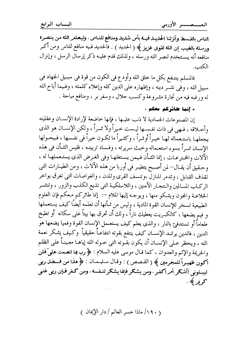 إن المصنوعات الجمادية لا ذنب عليها، فإنها خاضعة لإرادة الإنسان وعقليته وأخلاقه، فهي في ذات نفسها ليست خيراً ولا شراً، ولكن الإنسان هو الذي يجعلها باستعماله لها خيراً أو شراً، وكثيراً ما تكون خيراً في نفسها، فيحولها الإنسان شراً بسوء استعماله وخبث سريرته، وفساد تربيته، فليس الشأن في هذه الآلات والمخترعات، إنما الشأن فيمن يستغلها وفي الغرض الذي يستعملها له. وحقيق أن يقال - لمن أصبح يتطير في أوربا من هذه الآلات، ومن الطيارات التي تقذف القنابل، وتدمر المنازل، وتنسف القرى والمدن، والغواصات التي تغرق بواخر الركاب المسالمين والتجار الآمنين، واللاسلكية التي تذيع الكذب والزور، وتنشر الخلاعة والمجون ويشكو منها، ويوجه إليها الملام -: {قَالُوا طَائِرُكُمْ مَعَكُمْ} فإن العلوم الطبيعية تسخر للإنسان القوة المادية، وليس من شأنها أن تعلمه أيضاً كيف يستعملها، وفيم يضعها، كالكبريت يعطيك ناراً؛ ولك أن تحرق بها بيتاً على سكانه، أو تطبخ طعاماً أو تستدفئ بالنار، والذي يعلم كيف يستعمل الإنسان القوة وفيما يضعها هو الدين، فالدين يرشد الإنسان كيف ينتفع بقوته انتفاعاً حقيقياً، وكيف يشكر نعمة الله، ويحظر على الإنسان أن يكون بقوته التي خوله الله إياها معيناً على الظلم والجريمة والإثم والعدوان، كما