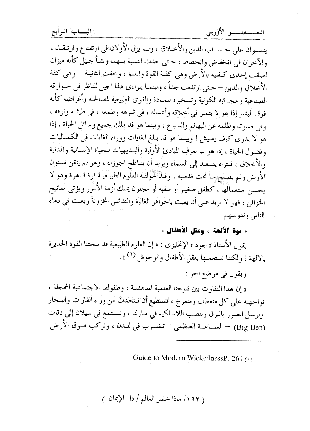 ينموان على حساب الدين والأخلاق، ولم يزل الأولان في ارتفاع وارتقاء، والآخران في انخفاض وانحطاط، حتى بعدت النسبة بينهما، ونشأ جيل كأنه ميزان لصقت إحدى كفتيه بالأرض وهي كفة القوة والعلم، وخفت الثانية - وهي كفة الأخلاق والدين - حتى ارتفعت جداً، وبينما يتراءى هذا الجيل للناظر في خوارقه الصناعية وعجائبه الكونية وتسخيره للمادة والقوى الطبيعية لمصالحه وأغراضه كأنه فوق البشر إذا هو لا يتميز في أخلاقه وأعماله، في شرهة وطمعه، في طيشه ونزقه، وفي قسوته وظلمه عن البهائم والسباع، وبينما هو قد ملك جميع وسائل الحياة، إذا هو لا يدري كيف يعيش! وبينما هو قد بلغ الغايات ووراء الغايات في الكماليات وفضول الحياة، إذا هو لا يدري كيف يعيش! وبينما هو قد بلغ الغايات ووراء الغايات في الكماليات وفضول الحياة، إذا هو لم يعرف المبادئ الأولية والبديهيات للحياة الإنسانية والمدنية والأخلاق، فتراه يصعد إلى السماء ويريد أن يناطح الجوزاء، وهو لم يتقن شئون الأرض ولم يصلح ما تحت قدميه، وقد خولته العلوم الطبيعية قوة قاهرة وهو لا يحسن استعمالها، كفل صغير أو سفيه أو مجنون يملك أزمَّة الأمور ويؤتى مفاتيح الخزائن، فهو لا يزيد على أن يعبث بالجواهر الغالية والنفائس المخزونة ويعيث في دماء الناس ونفوسهم.