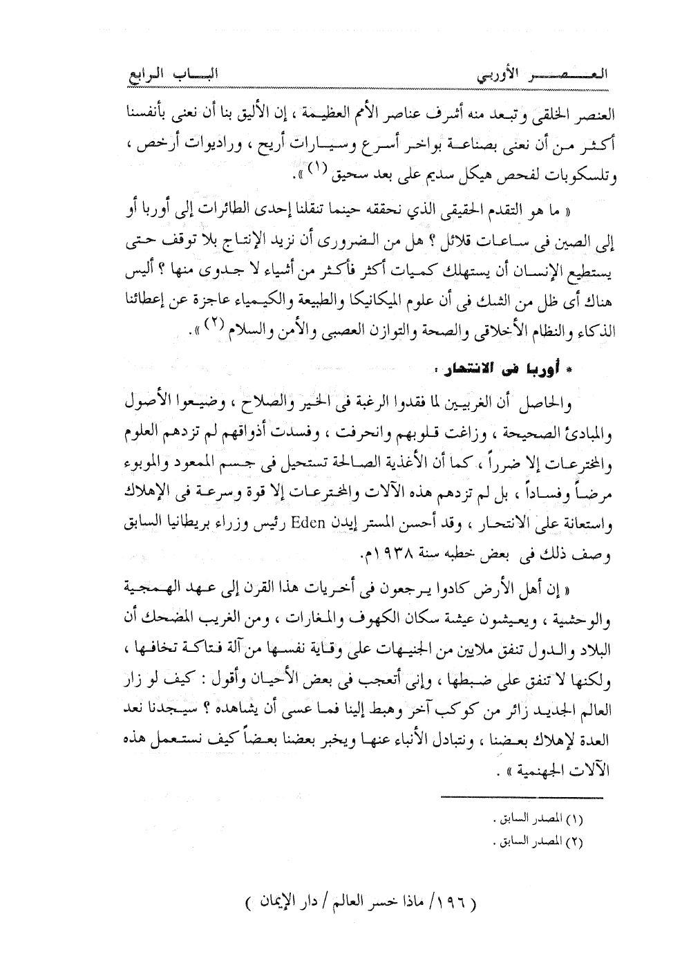 والحاصل أن الغربيين لما فقدوا الرغبة في الخير والصلاح، وضيعوا الأصول والمبادئ الصحيحة، وزاغت قلوبهم وانحرفت، وفسدت أذواقهم لم تزدهم العلوم والمخترعات إلا ضرراً، كما أن الأغذية الصالحة تستحيل في جسم الممعود والموبوء مرضاً وفساداً، بل لم تزدهم هذه الآلات والمخترعات إلا قوة وسرعة في الإهلاك واستعانة على الانتحار؛ وقد أحسن المستر ايدن Eden رئيس وزراء بريطانيا السابق وصف ذلك في بعض خطبه سنة 1938 م: