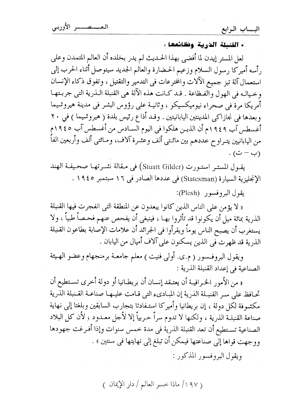 لعل المستر إيدن لما أفضى بهذا الحديث لم يدر بخلده أن العالم المتمدن وعلى رأسه أميركا رسول السلام وزعيم الحضارة والعالم الجديد سيتوصل أثناء الحرب إلى استعمال آلة تبز جميع الآلات والمخترعات في التدمير والتقتيل، وتفوق ذكاء الإنسان وخياله في الهول والفظاعة، قد كانت هذه الآلة هي القنبلة الذرية التي جربتها أمريكا مرة في صحراء نيوميكسيكو، وثانية على رؤوس البشر في مدينة هيروشيما، وبعدها في نجازاكي المدينتين اليابانيتين. وقد أذاع رئيس بلدة (هيروشيما) في 20 أغسطس آب 1949 م أن الذين هلكوا في اليوم السادس من أغسطس آب 1945 م من اليابانيين يتراوح عددهم بين مائتي ألف وعشرة آلاف ومائتي ألف وأربعين ألفاً (ب- ت) .