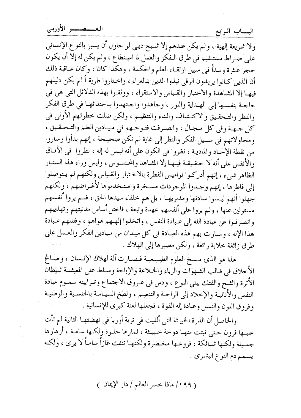 والحاصل أن البذرة الخبيثة التي ألقيت في تربة أوربا في نهضتها الثانية لم تأت عليها قرون حتى نبتت منها دوحة خبيثة، ثمارها حلوة ولكنها سامة، أزهارها جميلة ولكنها شائكة، فروعها مخضرة ولكنها تنفث غازاً ساماً لا يرى، ولكنه يسمم دم النوع البشري.