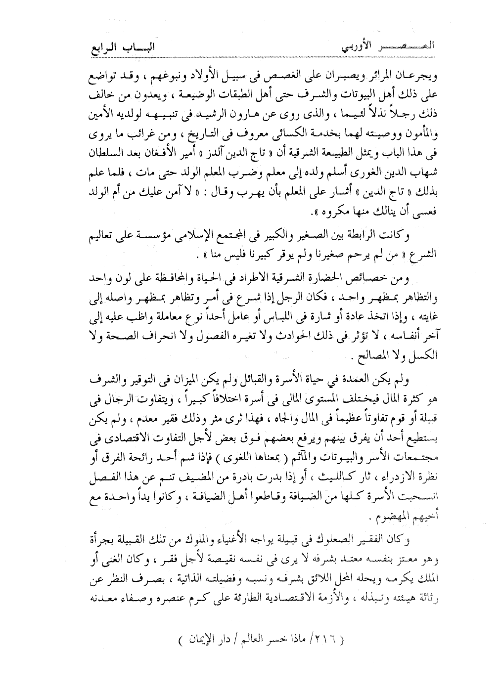 ويجرعان المرائر ويصبران على الغصص في سبيل الأولاد ونبوغهم، وقد تواضع على ذلك أهل البيوتات والشرف حتى أهل الطبقات الوضيعة، ويعدون من خالف ذلك رجلاً نذلاً لئيما، والذي روي عن هارون الرشيد في تنبيهه لولديه الأمين والمأمون ووصيته لهما بخدمة الكسائي معروف في التاريخ؛ ومن غرائب ما يروى في هذا الباب ويمثل الطبيعة الشرقية أن ((تاج الدين ألدز)) أمير الأفغان بعد السلطان شهاب الدين الغوري أسلم ولده إلى معلم وضرب المعلم الولد حتى مات، فلما علم بذلك ((تاج الدين)) أشار على المعلم بأن يهرب وقال: ((لا آمن عليك من أم الولد فعسى أن ينالك منها مكروه)) .