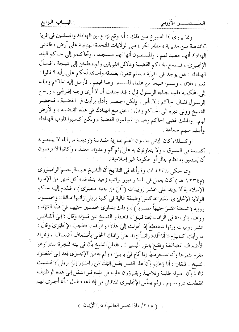 ومما حكى لنا الثقات وقرأناه في التاريخ أن الشيخ عبد الرحيم الرامبوري (م 1234 هـ) كان يعمل في بلدة رامبور براتب زهيد يتقاضاه كل شهر من الإمارة الإسلامية لا يزيد على عشر روبيات (أقل من جنيه مصري) فقدم إليه حاكم الولاية الإنجليزي المستر هاكنس وظيفة عالية في كلية بريلي راتبها مائتان وخمسون روبية (تسعة عشر جنيهاً مصرياً) ، وذلك يساوي خمسين جنيهاً في هذا العهد، ووعد بالزيادة في الراتب بعد قليل، فاعتذر الشيخ عن قبوله وقال: إني أتقاضى عشر روبيات وإنها ستنقطع إذا تحولت إلى هذه الوظيفة. فتعجب الإنجليزي وقال: ما رأيت كاليوم: أنا أقدم راتباً يزيد على راتبك الحالي بأضعاف أضعاف، وتترك الأضعاف المضاعفة وتقنع بالنزر اليسير!. فتعلل الشيخ بأن في بيته شجرة سدر وهو مغرم بثمرها وأنه سيحرمها إذا أقام في بريلي. ولم يفطن الإنجليزي بعد إلى مقصود الشيخ. فقال: أنا زعيم بأن هذا الثمر يصل إليك من رامبور إلى بريلي، فتشبث ثالثة بأن حوله طلبة وتلاميذ يقرؤون عليه في بلده فلو انتقل إلى هذه الوظيفة انقطعت دروسهم. ولم ييأس الإنجليزي المناقش من إقناعه فقال: أنا أجري لهم