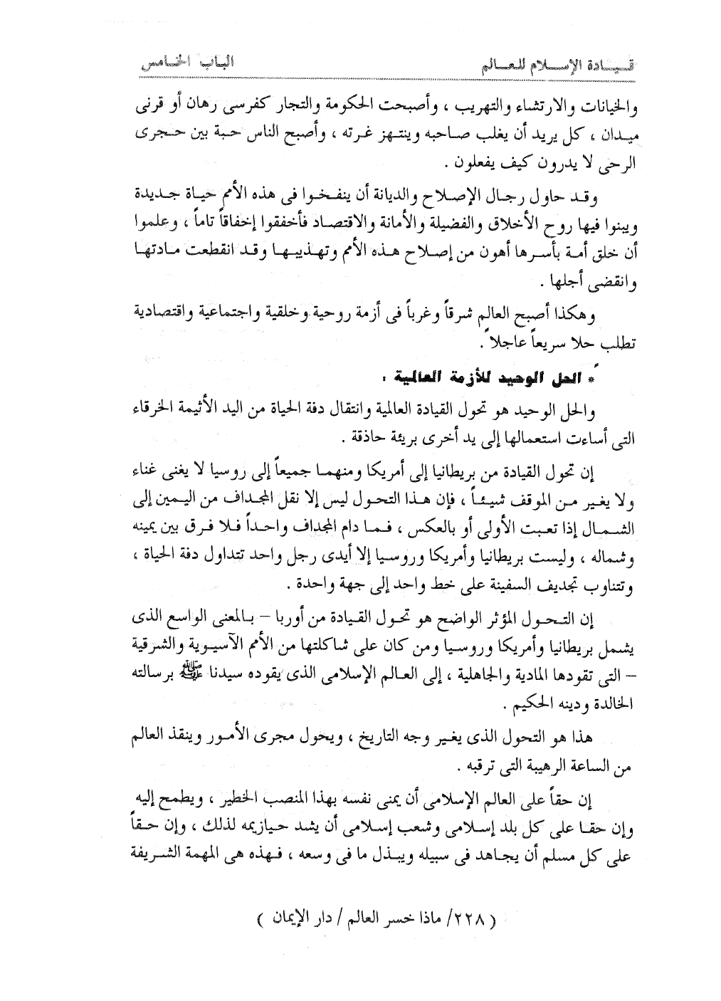 والحل الوحيد هو تحول القيادة العالمية وانتقال دفة الحياة من اليد الأثيمة الخرقاء التي أساءت استعمالها إلى يد أخرى بريئة حاذقة.