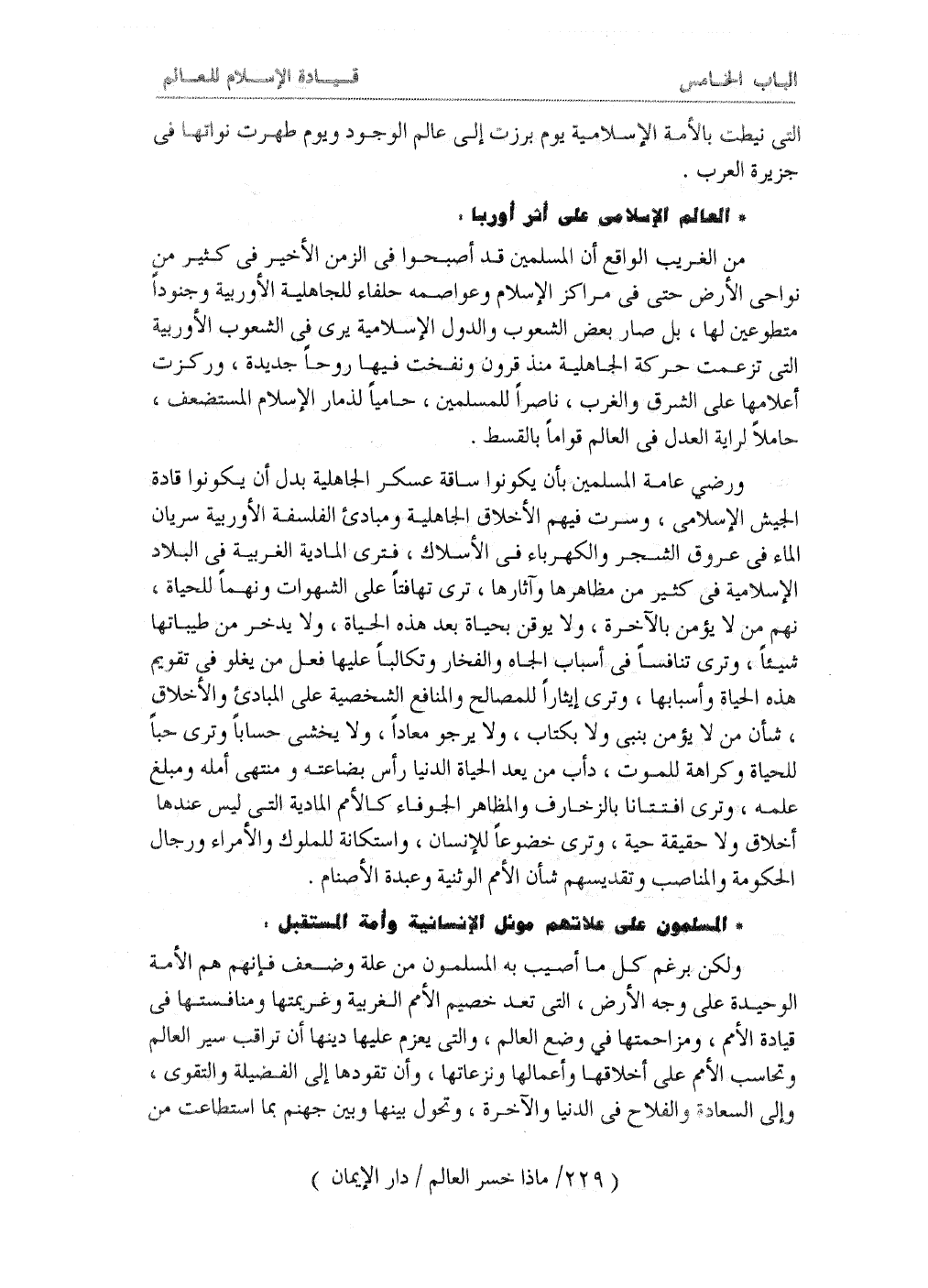 ولكن برغم كل ما أصيب به المسلمون من علة وضعف فإنهم هم الأمة الوحيدة على وجه الأرض، التي تعد خصيم الأمم الغربية وغريمتها ومنافستها في قيادة الأمم، ومزاحمتها في وضع العالم، والتي يعزم عليها دينها أن تراقب سير العالم وتحاسب الأمم على أخلاقها وأعمالها ونزعاتها، وأن تقودها إلى الفضيلة والتقوى، وإلى السعادة والفلاح في الدنيا والآخرة، وتحول بينها وبين جهنم بما استطاعت من