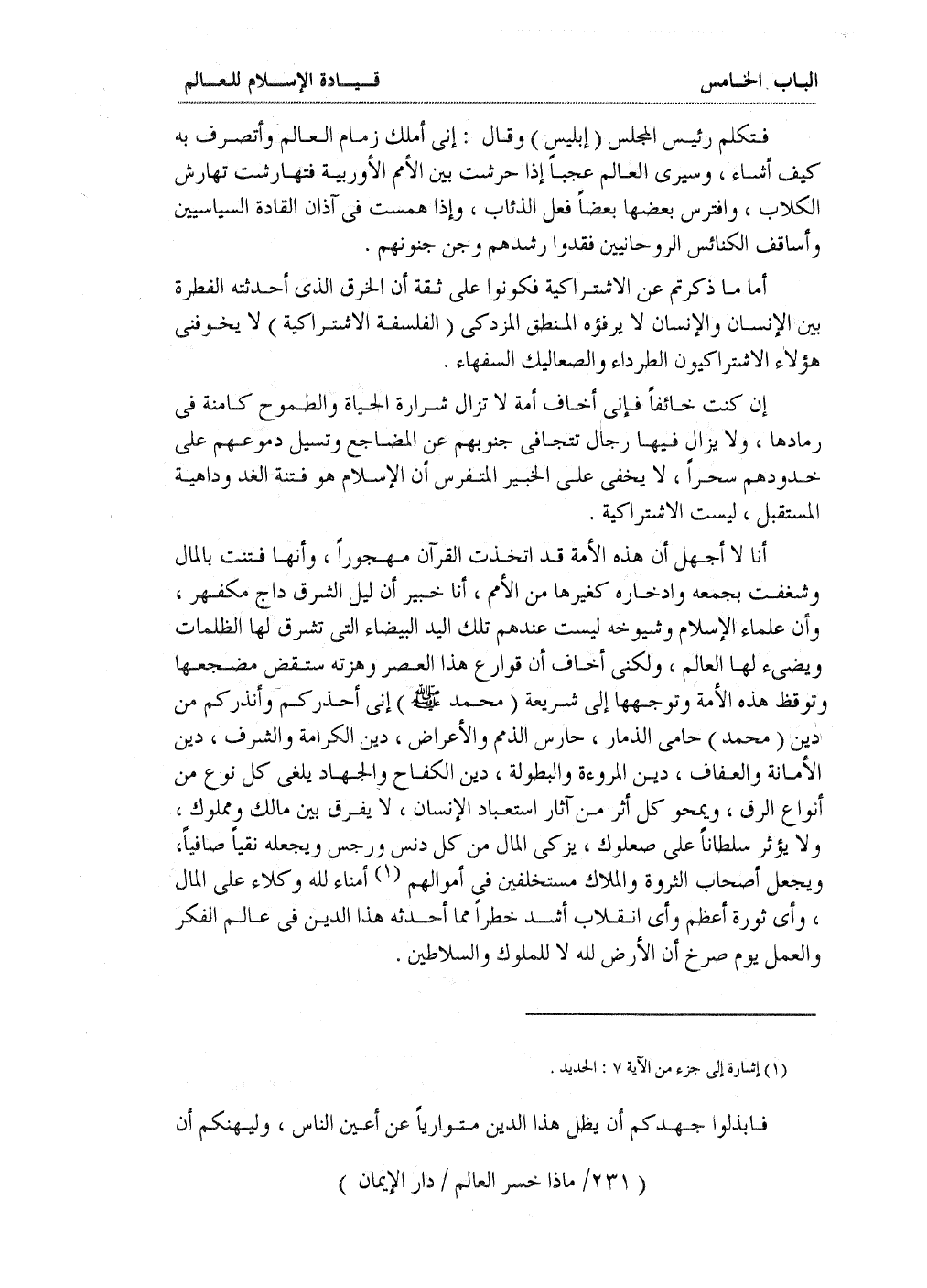إن كنت خائفاً فإني أخاف أمة لا تزال شرارة الحياة والطموح كامنة في رمادها ,ولا يزال فيها رجال تتجافى جنوبهم عن المضاجع وتسيل دموعهم على خدودهم سحراً، لا يخفى على الخبير المتفرس أن الإسلام هو فتنة الغد وداهية المستقبل، ليست الاشتراكية.