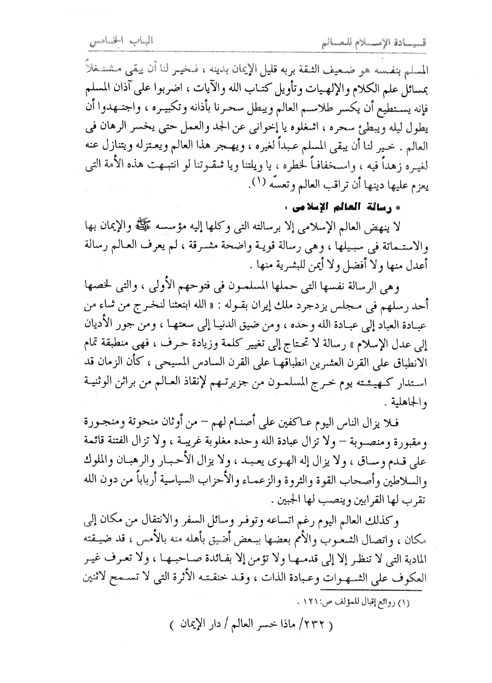 تحتاج إلى تغيير كلمة وزيادة حرف، فهي منطبقة تمام الانطباق على القرن العشرين انطباقها على القرن السادس المسيحي، كأن الزمان قد استدار كهيئته يوم خرج المسلمون من جزيرتهم لإنقاذ العالم من براثن الوثنية والجاهلية.