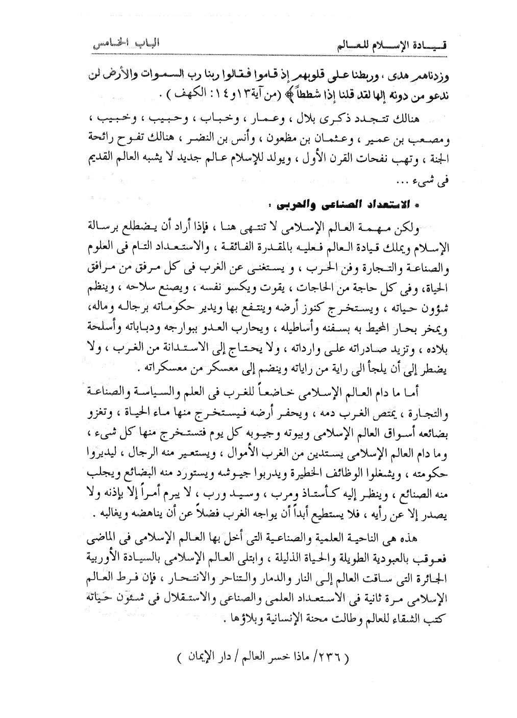 ولكن مهمة العالم الإسلامي لا تنتهي هنا، فإذا أراد أن يضطلع برسالة الإسلام ويملك قيادة العالم فعليه بالمقدرة الفائقة، والاستعداد التام في العلوم والصناعة والتجارة وفن الحرب، وأن يستغني عن الغرب في كل مرفق من مرافق الحياة، وفي كل حاجة من الحاجات، يقوت