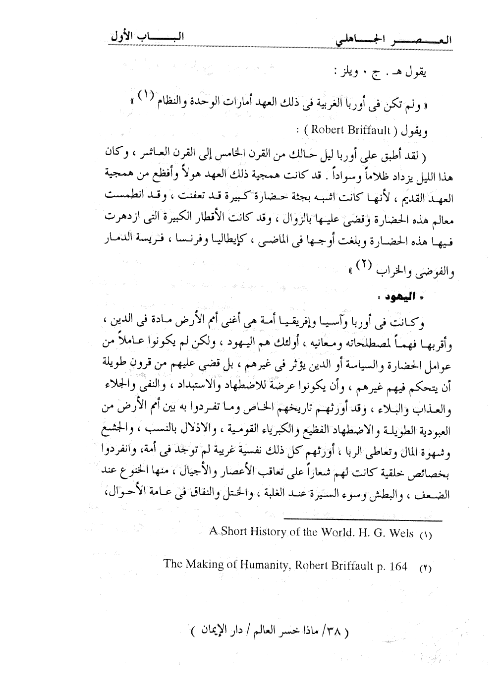 وكانت في أوربا وآسيا وإفريقيا أمة هي أغنى أمم الأرض مادة في الدين، وأقربها فهماً لمصطلحاته ومعانيه، أولئك هم اليهود، ولكن لم يكونوا عاملاً من عوامل الحضارة والسياسة أو الدين يؤثر في غيرهم، بل قُضي عليهم من قرون طويلة أن يتحكم فيهم غيرهم، وأن يكونوا عرضة للاضطهاد والاستبداد، والنفي والجلاء، والعذاب والبلاء، وقد أورثهم تاريخهم الخاص وما تفردوا به بين أمم الأرض من العبودية الطويلة والاضطهاد الفظيع والكبرياء القومية، والإدلال بالنسب، والجشع وشهوة المال وتعاطي الربا، أورثهم كل ذلك نفسية غريبة لم توجد في أمة وانفردوا بخصائص خلقية كانت لهم شعاراً على تعاقب الإعصار والأجيال، منها الخنوع عند الضعف، والبطش وسوء السيرة عند الغلبة، والختل والنفاق في عامة الأحوال،