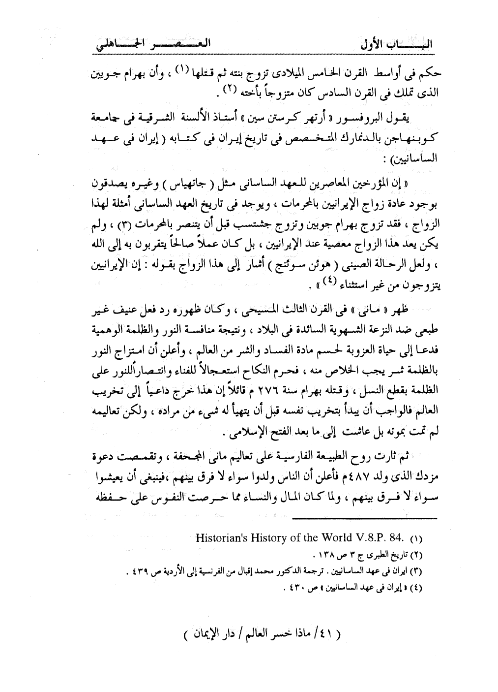 ((إن المؤرخين المعاصرين للعهد الساساني مثل (جاتهياس) وغيره، يصدقون بوجود عادة زواج الإيرانيين بالمحرمات، ويوجد في تاريخ العهد الساساني أمثلة لهذا الزواج، فقد تزوج بهرام جوبين وتزوج جشتسب قبل أن يتنصر بالمحرمات (¬3) ، ولم يكن يعد هذا الزواج معصية عند الإيرانيين، بل كان عملاً صالحاً يتقربون به إلى الله، ولعل الرحالة الصيني (هوئن سوئنج) أشار إلى هذا الزواج بقوله: إن الإيرانيين يتزوجون من غير استثناء (¬4)) .