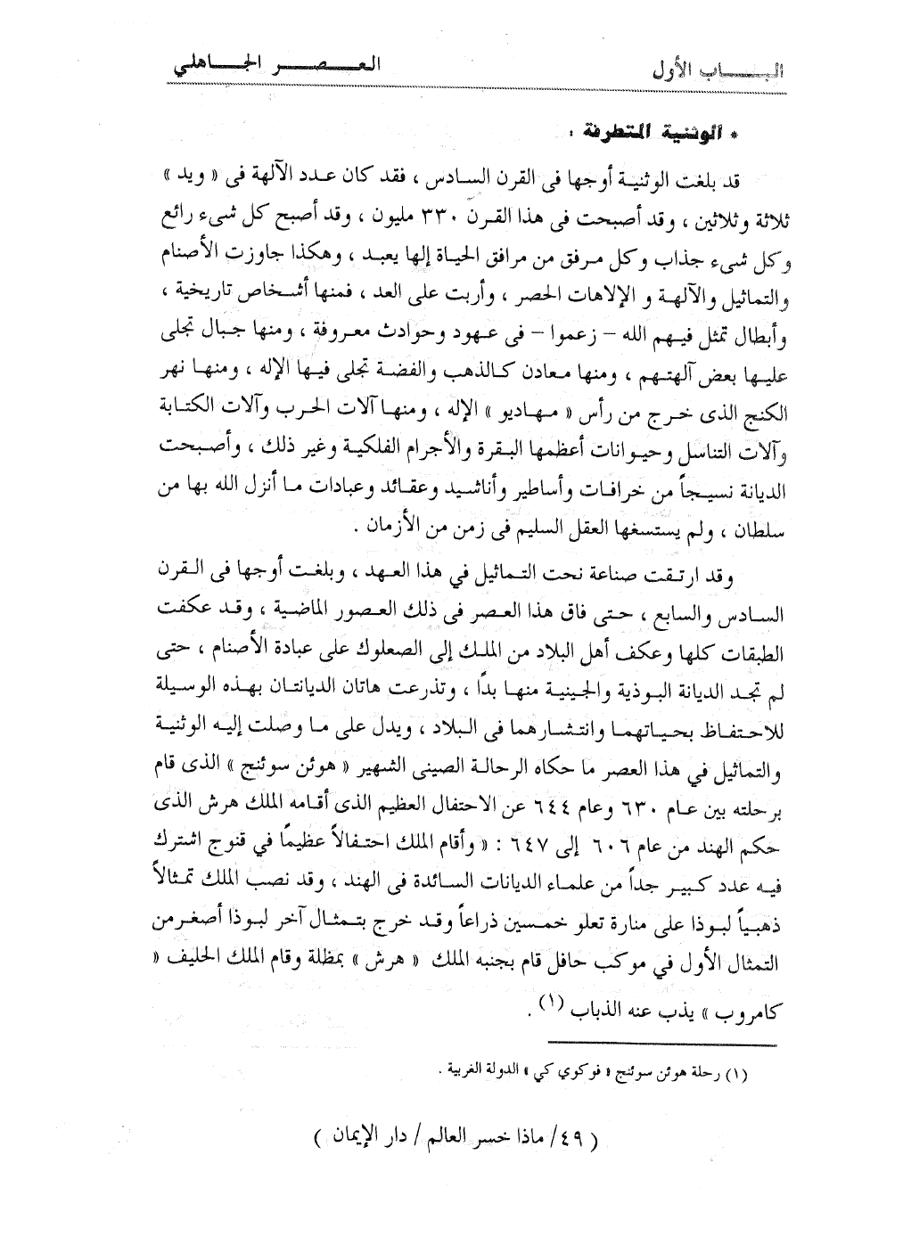 منها بدا، وتذرعت هاتان الديانتان بهذه الوسيلة للاحتفاظ بحياتهما وانتشارهما في البلاد. ويدل على ما وصلت إليه الوثنية والتماثيل في هذا العصر ما حكاه الرحالة الصيني الشهير " هوئن سوئنج " الذي قام برحلته بين عام 630 وعام 644 عن الاحتفال العظيم الذي أقامه الملك هرش الذي حكم الهند من عام 606 إلى 647: ((وأقام الملك احتفالاً عظيماً في قنوج اشترك فيه عدد كبير جداً من علماء الديانات السائدة في الهند، وقد نصب الملك تمثالاً ذهبياً لبوذة على منارة تعلو خمسين ذراعاً، وقد خرج بتمثال آخر لبوذة أصغر من التمثال الأول في موكب حافل قام بجنبه الملك " هرش " بمظلة وقام الملك الحليف " كامروب " يذب عنه الذباب (¬1)) .