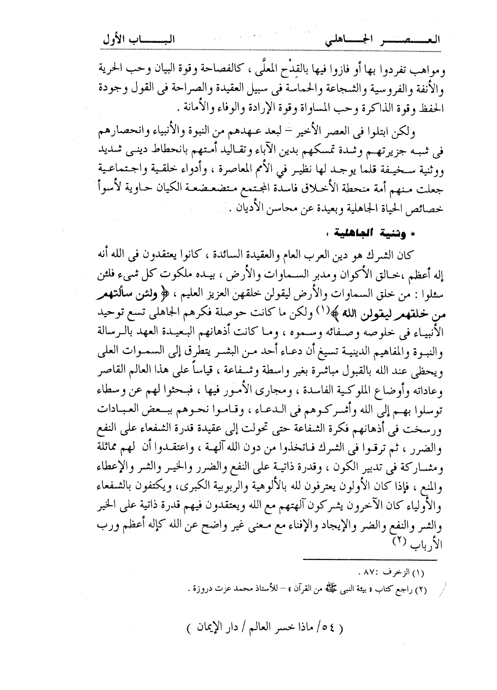 ولكن ابتلوا في العصر الأخير- لبعد عهدهم من النبوة والأنبياء وانحصارهم في شبه جزيرتهم وشدة تمسكهم بدين الآباء وتقاليد أمتهم بانحطاط ديني شديد ووثنية سخيفة قلما يوجد لها نظير في الأمم المعاصرة، وأدواء خلقية واجتماعية جعلت منهم أمة منحطة الأخلاق فاسدة المجتمع متضعضعة الكيان حاوية لأسوأ خصائص الحياة الجاهلية وبعيدة عن محاسن الأديان.