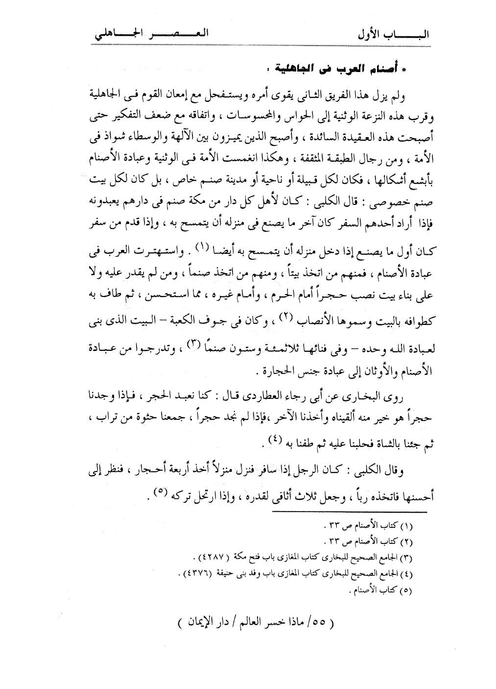 ولم يزل هذا الفريق الثاني يقوى أمره ويستفحل مع إمعان القوم في الجاهلية وقرب هذه النزعة الوثنية إلى الحواس والمحسوسات واتفاقه مع ضعف التفكير حتى أصبحت هذه العقيدة السائدة وأصبح الذين يميزون بين الآلهة والوسطاء شواذ في الأمة، ومن رجال الطبقة المثقفة، وهكذا انغمست الأمة في الوثنية وعبادة الأصنام بأبشع أشكالها، فكان لكل قبيلة أو ناحية أو مدينة صنم خاص، بل كان لكل بيت صنم خصوصي: قال الكلبي: كان لأهل كل دار من مكة صنم في دارهم يعبدونه، فإذا أراد أحدهم السفر كان آخر ما يصنع في منزله أن يتمسح به، وإذا قدم من سفر كان أول ما يصنع إذا دخل منزله أن يتمسح به أيضاً (¬1) . واستهترت العرب في عبادة الأصنام، فمنهم من اتخذ بيتاً، ومنهم من اتخذ صنماً، ومن لم يقدر عليه ولا على بناء بيت نصب حجراً أمام الحرم، وأمام غيره، مما استحسن، ثم طاف به كطوافه بالبيت وسموها الأنصاب (¬2) . وكان في جوف الكعبة- البيت الذي بني لعبادة الله وحده- وفي فنائها ثلاث مائة وستون صنماً (¬3) ، وتدرجوا من عبادة الأصنام والأوثان إلى عبادة جنس الحجارة.