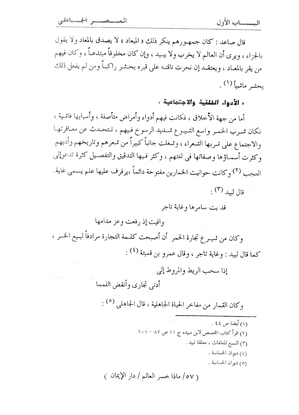 قال صاعد: كان جمهورهم ينكر ذلك "الميعاد" لا يصدق بالمعاد ولا يقول بالجزاء، ويرى أن العالم لا يخرب ولا يبيد، وإن كان مخلوقاً مبتدعاً، وكان فيهم من يقر بالمعاد، ويعتقد إن نحرت ناقته على قبره يحشر راكباً، ومن لم يفعل ذلك يحشر ماشياً (¬1) .
