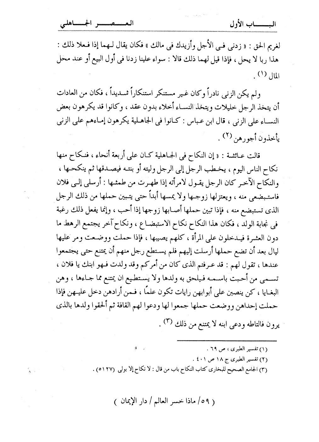 يمسها أبداً حتى يتبين حملها من ذلك الرجل الذي تستبضع منه، فإذا تبين حملها أصابها زوجها إذا أحب، وإنما يفعل ذلك رغبة في نجاة الولد، فكان هذا النكاح نكاح الاستبضاع، ونكاح آخر يجتمع الرهط ما دون العشرة فيدخلون على المرأة، كلهم يصيبها، فإذا حملت ووضعت ومرَّ عليها ليال بعد أن تضع حملها أرسلت إليهم فلم يستطيع رجل منهم أن يمتنع حتى يجتمعوا عندها، تقول لهم: قد عرفتم الذي كان من أمركم وقد ولدت فهو ابنك يا فلان، تسمي من أحبت باسمه فيلحق به ولدها ولا يستطيع أن يمتنع ممن جاءها، وهن البغايا كن ينصبن على أبوابهن رايات تكون علما، فمن ارادهن دخل عليهن فإذا حملت إحداهن ووضعت حملها جمعوا لها ودعوا لها القافة ثم ألحقوا ولدها بالذي يرون فالتاطه ودعي ابنه لا يمتنع من ذلك (¬3) .
