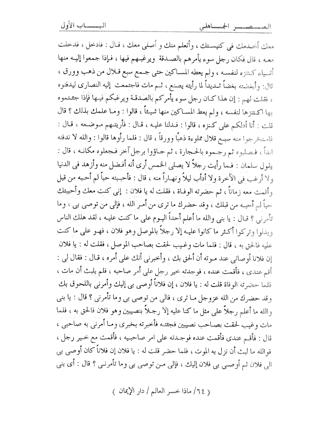معك أخدمك في كنيستك وأتعلم منك وأصلي معك، قال: فادخل، فدخلت معه، قال فكان رجل سوء يأمرهم بالصدقة ويرغبهم فيها، فإذا جمعوا إليه منها أشياء اكتنزه لنفسه، ولم يعطه المساكين حتى جمع سبع قلال من ذهب وورِق، قال: وأبغضته بغضاً شديداً لما رأيته يصنع، ثم مات فاجتمعت إليه النصارى ليدفنوه، فقلت لهم: إن هذا كان رجل سوء، يأمركم بالصدقة ويرغبكم فيها فإذا جئتموه بها اكتنزها لنفسه، ولم يعط المساكين منها شيئاً، قالوا: وما علمك بذلك؟ قال قلت: أنا أدلكم على كنزه، قالوا: فدلنا عليه، قال فأريتهم موضعه، قال: فاستخرجوا منه سبع قلال مملوءة ذهباً وورقاً، قال: فلما رأوها، قالوا: والله لا ندفنه أبداً، فصلبوه ثم رجموه بالحجارة، ثم جاؤوا برجل آخر فجعلوه مكانه، قال: يقول سلمان: فما رأيت رجلاً لا يصلي الخمس أرى أنه أفضل منه وأزهد في الدنيا وأرغب في الآخرة ولا أدأب ليلاً ونهاراً منه، قال: فأحببته حباً لم أحبه من قبل وأقمت معه زماناً، ثم حضرته الوفاة، فقلت له يا فلان: إني كنت معك وأحببتك حباً م أُحبه من قبلك، وقد حضرك ما ترى من أمر الله، فإلى من توصى بي، وما تأمرني؟ قال: يا بني والله ما اعلم أحداً اليوم على ما كنت عليه، لقد هلك الناس وبدلوا وتركوا أكثر ما كانوا عليه إلا رجلاً بالموصل وهو فلان، فهو على ما كنت عليه فالحق به، قال: فلما مات وغيب لحقت بصاحب الموصل، فقلت له: يا فلان إن فلاناً أوصاني عند موته أن ألحق بك، وأخبرني أنك على أمره. قال: فقال لي: أقم عندي، فأقمت عنده، فوجدته خير رجل على أمر صاحبه، فلم يلبث أن مات فلما حضرته الوفاة، قلت له: يا فلان، إن فلاناً أوصى بي أليك وأمرني باللحوق بك، وقد حضرك من الله عز وجل ما ترى، فإلى من توصى بي وما تأمرني؟ قال: يا بني والله ما أعلم رجلاً على مثل ما كنا عليه إلا رجلا بنصيبين وهو فلان فالحق به، فلما مات وغيب لحقت بصاحب نصيبين فجئته فأخبرته بخبري وما أمرني به صاحبي، قال فأقم عندي فأقمت عنده فوجدته على أمر صاحبيه، فأقمت مع خير رجل، فو الله ما لبث أن نزل به الموت، فلما حضر قلت له: يا فلان إن فلاناً كان أوصى بي إلى فلان ثم أوصى بي فلان إليك، فإلى
