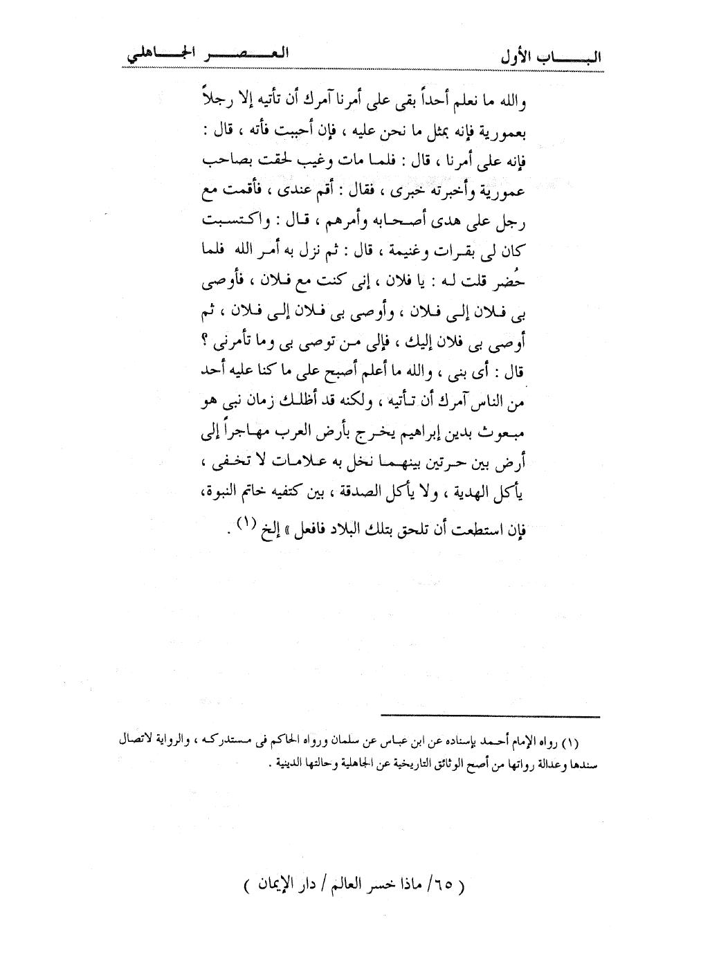 (¬1) رواه الإمام أحمد بإسناده عن ابن عباس عن سلمان ورواه الحاكم في مستدركه. والرواية لاتصال سندها وعدالة رواتها من أصح الوثائق التاريخية عن الجاهلية وحالتها الدينية.