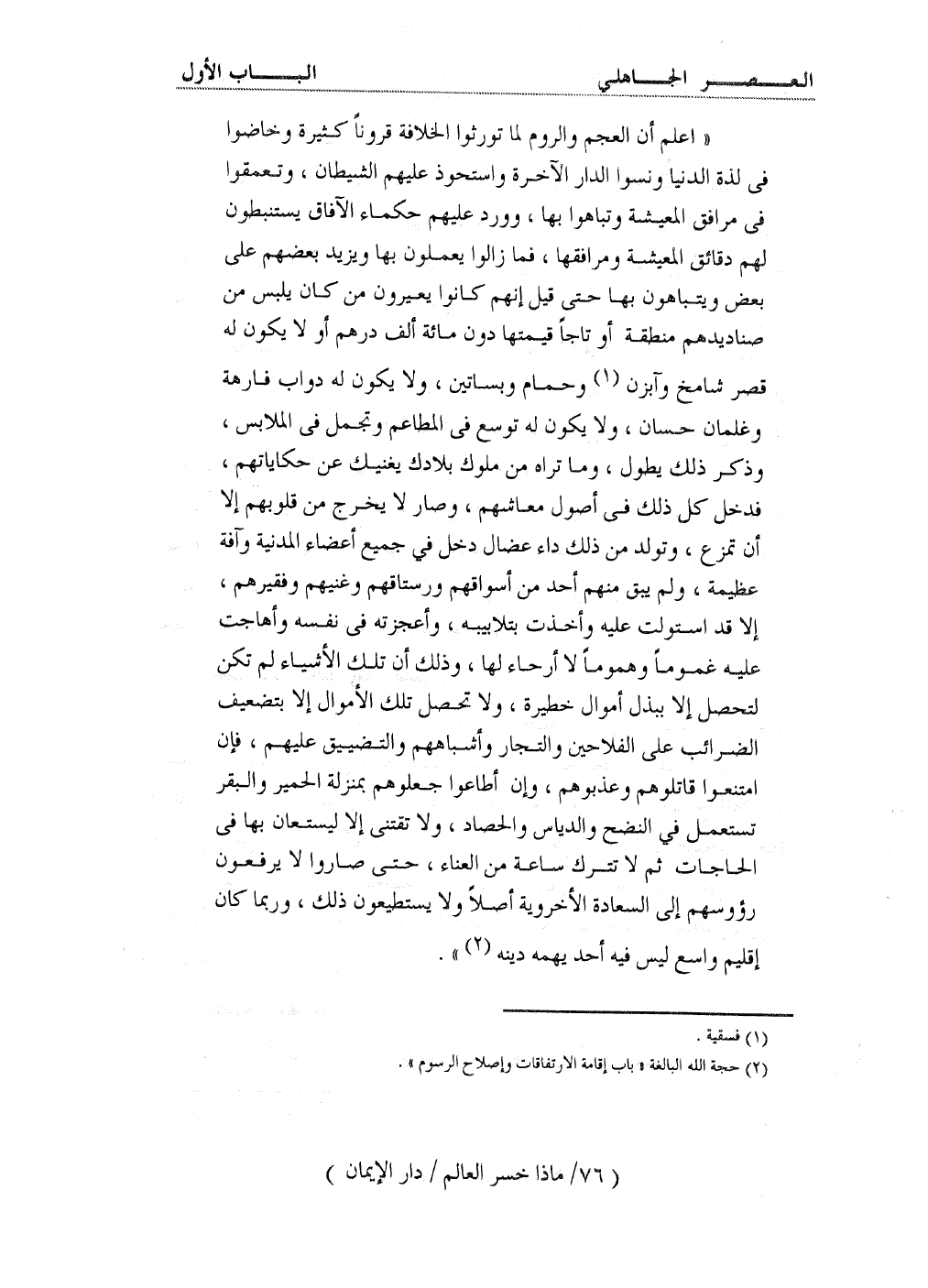 ((اعلم أن العجم والروم لما توارثوا الخلافة قروناً كثيرة وخاضوا في لذة الدنيا ونسوا الدار الآخرة واستحوذ عليهم الشيطان، وتعمقوا في مرافق المعيشة وتباهوا بها، وورد عليهم حكماء الآفاق يستنبطون لهم دقائق المعيشة ومرافقها، فما زالوا يعملون بها ويزيد بعضهم على بعض ويتباهون بها حتى قيل إنهم كانوا يعيرون من كان يلبس من صناديدهم منطقة أو تاجاً قيمتها دون مائة ألف درهم أو لا يكون له قصر شامخ وآبزن (¬1) وحمام وبساتين، ولا يكون له دواب فارهة وغلمان حسان، ولا يكون له توسع في المطاعم وتجمل في الملابس وذكر ذلك يطول، وما تراه من ملوك بلادك يغنيك عن حكاياتهم، فدخل كل ذلك في أصول معاشهم، وصار لا يخرج من قلوبهم إلا أن تمزع، وتولد من ذلك داء عضال دخل في جميع أعضاء المدينة وآفة عظيمة، ولم يبق منهم أحد من أسواقهم ورستاقهم وغنيهم وفقيرهم، إلا قد استولت عليه وأخذت بتلابيبه، وأعجزته في نفسه وأهاجت عليه غموماً وهموماً لا أرحاء لها، وذلك أن تلك الأشياء لم تكن لتحصل إلا ببذل أموال خطيرة، ولا تحصل تلك الأموال إلا بتضعيف الضرائب على الفلاحين والتجار وأشباههم والتضييق عليهم، فإن امتنعوا قاتلوهم وعذبوهم، وإن أطاعوا جعلوهم بمنزلة الحمير والبقر تستعمل في النضح والدياس والحصاد، ولا تقتنى إلا ليستعان بها في الحاجات، ثم لا تترك ساعة من الغناء، حتى صاروا لا يرفعون رؤوسهم إلى السعادة الأخروية أصلاً ولا يستطيعون ذلك، وربما كان إقليم واسع ليس فيه أحد يهمه دينه (¬2)) .