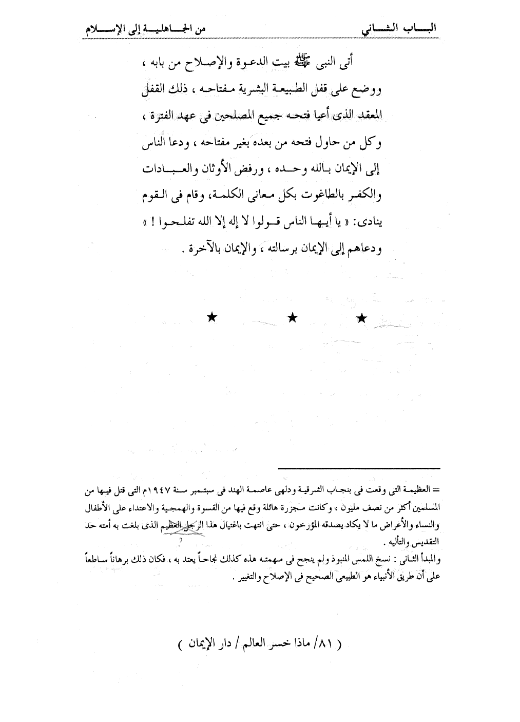 أتى النبي صلى الله عليه وسلم بيت الدعوة والإصلاح من بابه، ووضع على قفل الطبيعة البشرية مفتاحه، ذلك القفل المعقد الذي أعيا فتحه جميع المصلحين في عهد الفترة، وكل من حاول فتحه من بعده بغير مفتاحه. ودعا الناس إلى الإيمان بالله وحده، ورفض الأوثان والعبادات والكفر بالطاغوت بكل معاني الكلمة وقام في القوم ينادي: ((يا أيها الناس قولوا لا إله إلا الله تفلحوا!)) ودعاهم إلى الإيمان برسالته، والإيمان بالآخرة.