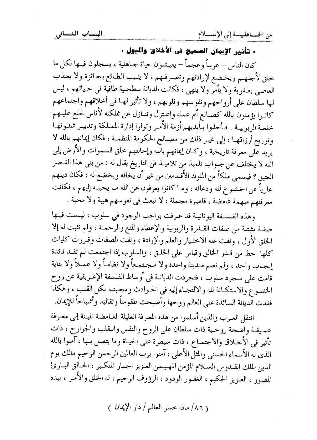 انتقل العرب والذين أسلموا من هذه المعرفة العليلة الغامضة الميتة إلى معرفة عميقة واضحة روحية ذات سلطان على الروح والنفس والقلب والجوارح، ذات تأثير في الأخلاق والاجتماع، ذات سيطرة على الحياة وما يتصل بها، آمنوا بالله الذي له الأسماء الحسنى والمثل الأعلى، آمنوا برب العالمين الرحمن الرحيم مالك يوم الدين الملك القدوس السلام المؤمن المهيمن العزيز الجبار المتكبر، الخالق البارئ المصور، العزيز الحكيم، الغفور الودود، الرؤوف الرحيم، له الخلق والأمر، بيده