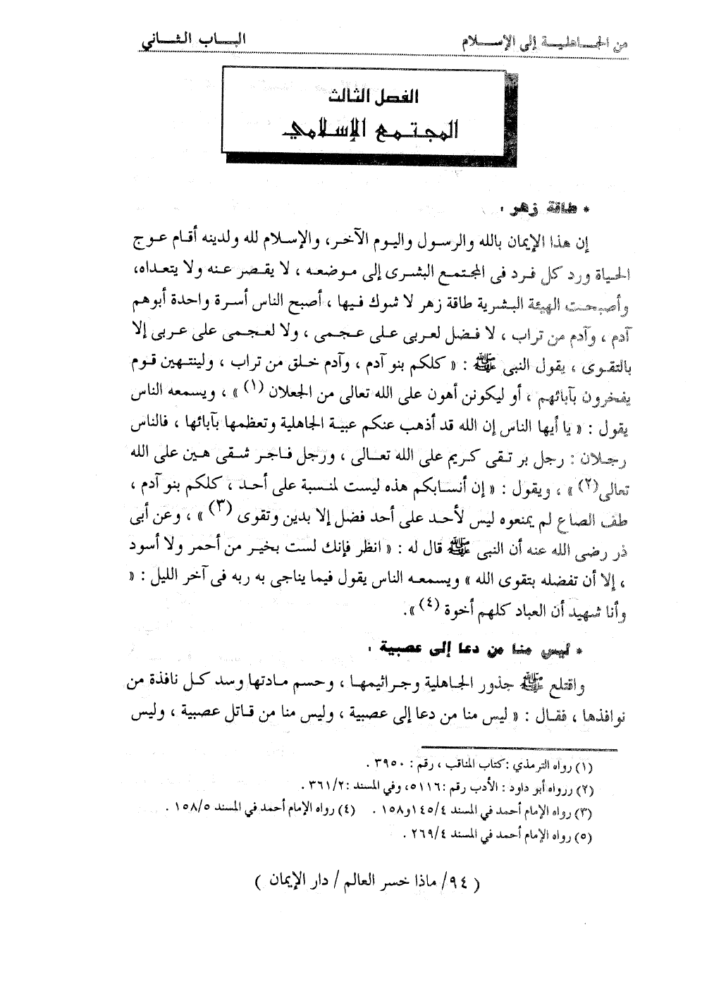 واقتلع صلى الله عليه وسلم جذور الجاهلية وجراثيمها، وحسم مادتها، وسد كل نافذة من نوافذها، فقال: ((ليس منا من دعا إلى عصبية، وليس منا من قاتل على عصبية، وليس