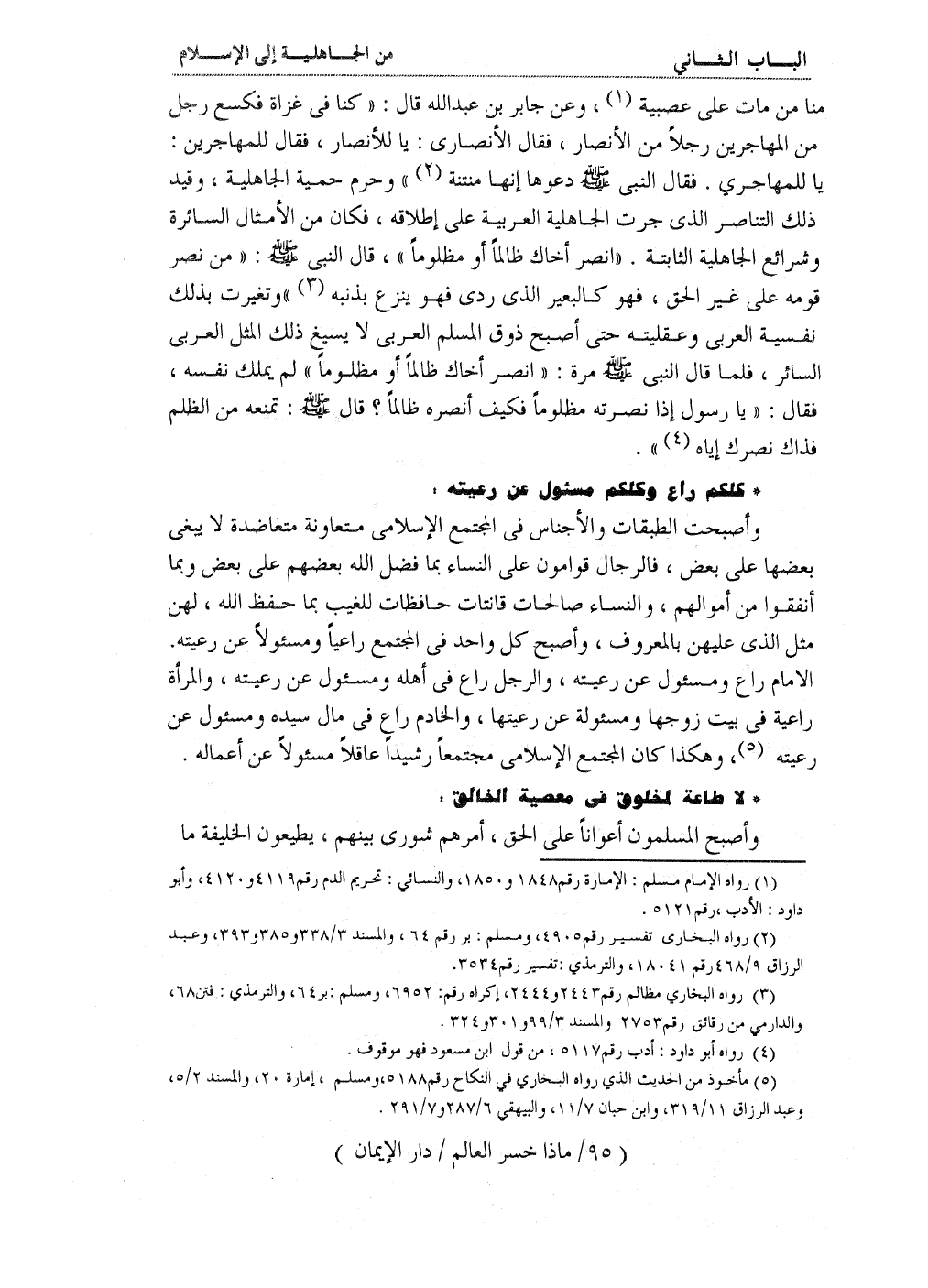وأصبحت الطبقات والأجناس في المجتمع الإسلامي متعاونة متعاضدة لا يبغى بعضها على بعض، فالرجال قوامون على النساء بما فضل الله بعضهم على بعض وبما أنفقوا من أموالهم. والنساء صالحات قانتات حافظات للغيب بما حفظ الله، لهن مثل الذي عليهن بالمعروف، وأصبح كل واحد في المجتمع راعياً ومسئولاً عن رعيته. الإمام راع ومسئول عن رعيته، والرجل راع في أهله ومسئول عن رعيته، والمرأة راعية في بيت زوجها ومسئولة عن رعيتها، والخادم راع في مال سيده ومسئول عن رعيته (¬5) ، وهكذا كان المجتمع الإسلامي مجتمعاً رشيداً عاقلاً مسئولاً عن أعماله.