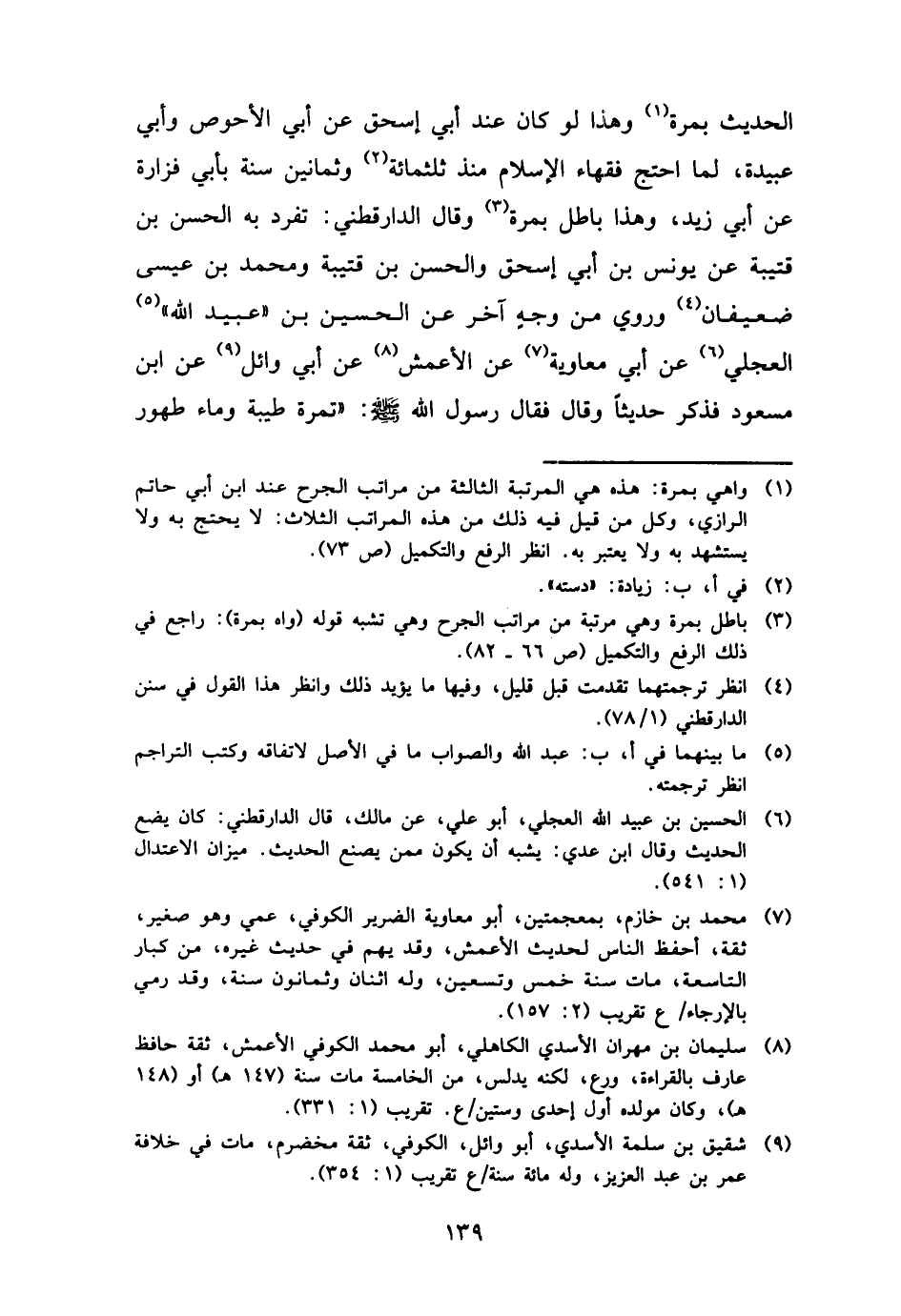 الحَدِيث بِمرَّة وَهَذَا لَو كَانَ عِنْد أبي إِسْحَق عَن أبي الْأَحْوَص وَأبي عُبَيْدَة، لما احْتج فُقَهَاء الْإِسْلَام مُنْذُ ثلثمِائة وَثَمَانِينَ سنة بِأبي فَزَارَة عَن أبي زيد، وَهَذَا بَاطِل بِمرَّة وَقَالَ الدَّارَقُطْنِيّ: تفرد بِهِ الْحسن بن قُتَيْبَة عَن يُونُس بن أبي إِسْحَق وَالْحسن بن قُتَيْبَة وَمُحَمّد بن عِيسَى ضعيفان وَرُوِيَ من وَجه آخر عَن الْحُسَيْن بن " عبيد الله " الْعجلِيّ عَن أبي مُعَاوِيَة عَن الْأَعْمَش عَن أبي وَائِل عَن ابْن مَسْعُود فَذكر حَدِيثا وَقَالَ فَقَالَ رَسُول الله - صَلَّى اللَّهُ عَلَيْهِ وَسَلَّم َ -: " تَمْرَة طيبَة وَمَاء طهُور