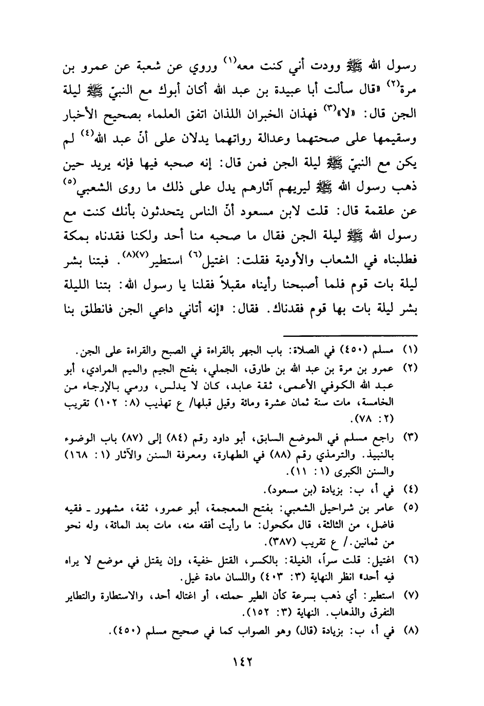 رَسُول الله - صَلَّى اللَّهُ عَلَيْهِ وَسَلَّم َ - وودت أَنِّي كنت مَعَه وَرُوِيَ عَن شُعْبَة عَن عَمْرو بن مرّة " قَالَ سَأَلت أَبَا عُبَيْدَة بن عبد الله أَكَانَ أَبوك مَعَ النَّبِي - صَلَّى اللَّهُ عَلَيْهِ وَسَلَّم َ - لَيْلَة الْجِنّ قَالَ: " لَا " فهذان الخبران اللَّذَان اتّفق الْعلمَاء بِصَحِيح الْأَخْبَار وسقيمها على صحتهما وعدالة رواتهما يدلان على أَن عبد الله لم يكن مَعَ النَّبِي - صَلَّى اللَّهُ عَلَيْهِ وَسَلَّم َ - لَيْلَة الْجِنّ فَمن قَالَ: إِنَّه صَحبه فِيهَا فَإِنَّهُ يُرِيد حِين ذهب رَسُول الله - صَلَّى اللَّهُ عَلَيْهِ وَسَلَّم َ - لِيُرِيَهُمْ آثَارهم يدل على ذَلِك مَا روى الشّعبِيّ عَن عَلْقَمَة قَالَ: قلت لِابْنِ مَسْعُود أَن النَّاس يتحدثون بأنك كنت مَعَ رَسُول الله - صَلَّى اللَّهُ عَلَيْهِ وَسَلَّم َ - لَيْلَة الْجِنّ فَقَالَ مَا صَحبه منا أحد وَلَكنَّا فقدناه بِمَكَّة فطلبناه فِي الشعاب والأودية فَقلت: اغتيل استطير. فبتنا بشر لَيْلَة بَات قوم فَلَمَّا أَصْبَحْنَا رَأَيْنَاهُ مُقبلا فَقُلْنَا يَا رَسُول الله: بتنا اللَّيْلَة بشر لَيْلَة بَات بهَا قوم فقدناك. فَقَالَ: " إِنَّه أَتَانِي دَاعِي الْجِنّ فَانْطَلق بِنَا