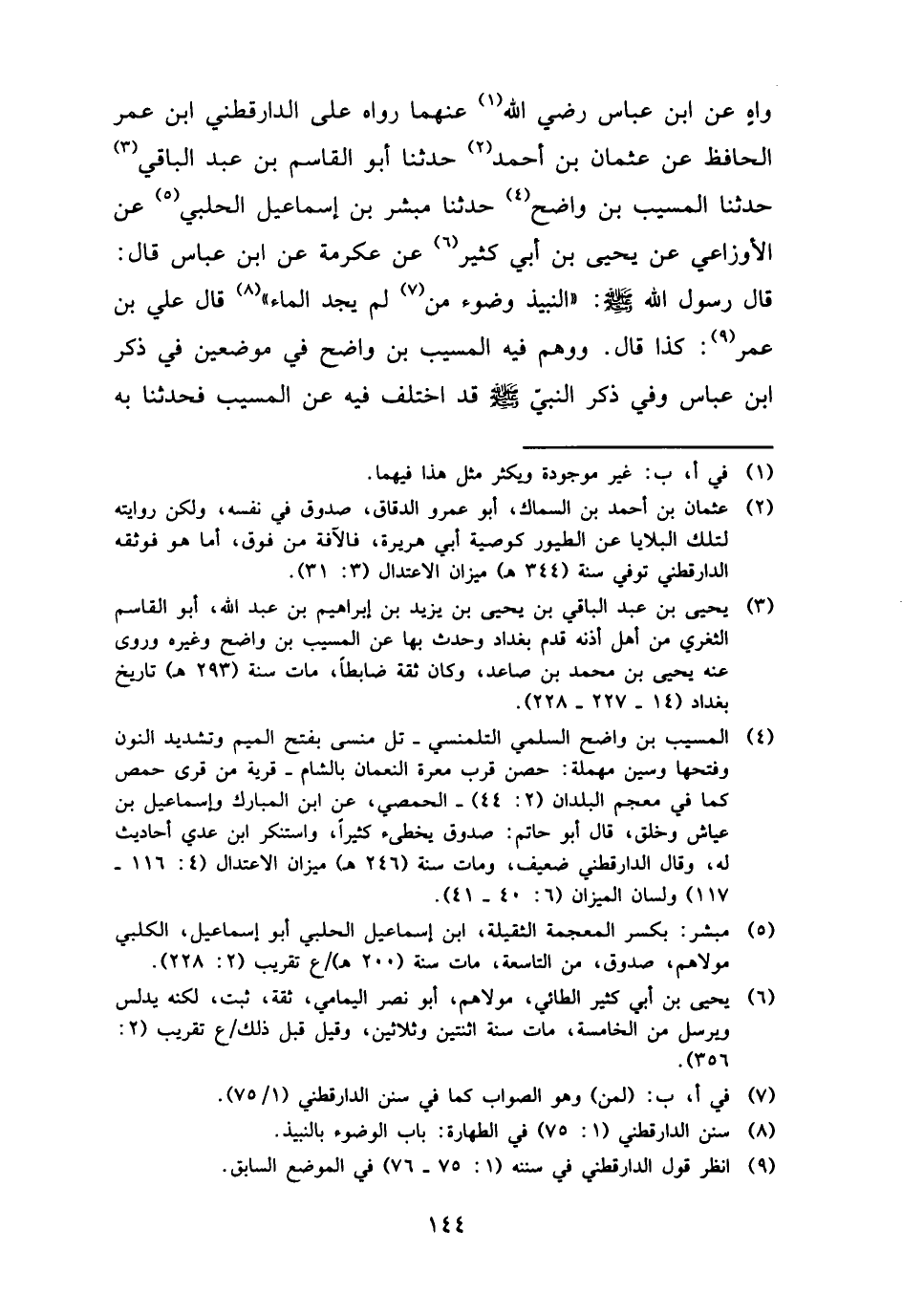 واه عَن ابْن عَبَّاس رَضِي الله عَنْهُمَا رَوَاهُ على الدَّارَقُطْنِيّ ابْن عمر الْحَافِظ عَن عُثْمَان بن أَحْمد حَدثنَا أَبُو الْقَاسِم بن عبد الْبَاقِي حَدثنَا الْمسيب بن وَاضح حَدثنَا مُبشر بن إِسْمَاعِيل الْحلَبِي عَن الْأَوْزَاعِيّ عَن يحيى بن أبي كثير عَن عِكْرِمَة عَن ابْن عَبَّاس قَالَ: قَالَ رَسُول الله - صَلَّى اللَّهُ عَلَيْهِ وَسَلَّم َ -: " النَّبِيذ وضوء من لم يجد المَاء " قَالَ عَليّ بن عمر: كَذَا قَالَ. وَوهم فِيهِ الْمسيب بن وَاضح فِي موضِعين فِي ذكر ابْن عَبَّاس وَفِي ذكر النَّبِي - صَلَّى اللَّهُ عَلَيْهِ وَسَلَّم َ - قد اخْتلف فِيهِ عَن الْمسيب فحدثنا بِهِ