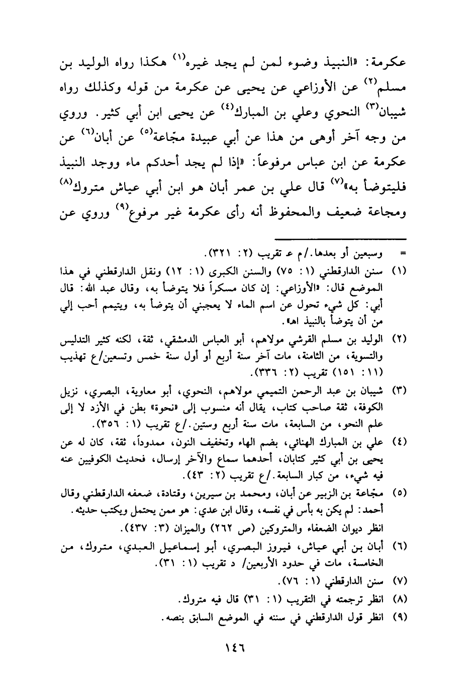 عِكْرِمَة: " النَّبِيذ وضوء لمن لم يجد غَيره هَكَذَا رَوَاهُ الْوَلِيد بن مُسلم عَن الْأَوْزَاعِيّ عَن يحيى عَن عِكْرِمَة من قَوْله وَكَذَلِكَ رَوَاهُ شَيبَان النَّحْوِيّ وَعلي بن الْمُبَارك عَن يحيى ابْن أبي كثير. وَرُوِيَ من وَجه آخر أَوْهَى من هَذَا عَن أبي عُبَيْدَة مجاعَة عَن أبان عَن عِكْرِمَة عَن ابْن عَبَّاس مَرْفُوعا: " إِذا لم يجد أحدكُم مَاء وَوجد النَّبِيذ فَليَتَوَضَّأ بِهِ " قَالَ عَليّ بن عمر أبان هُوَ ابْن أبي عَيَّاش مَتْرُوك ومجاعة ضَعِيف وَالْمَحْفُوظ أَنه رأى عِكْرِمَة غير مَرْفُوع وَرُوِيَ عَن