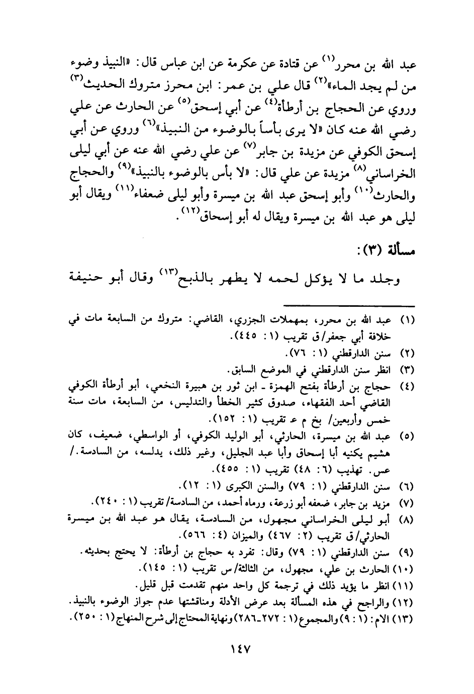 عبد الله بن مُحَرر عَن قَتَادَة عَن عِكْرِمَة عَن ابْن عَبَّاس قَالَ: " النَّبِيذ وضوء من لم يجد المَاء " قَالَ عَليّ بن عمر: ابْن مُحرز مَتْرُوك الحَدِيث وَرُوِيَ عَن الْحجَّاج بن أَرْطَأَة عَن أبي إِسْحَق عَن الْحَارِث عَن عَليّ رَضِي الله عَنهُ كَانَ " لَا يرى بَأْسا بِالْوضُوءِ من النَّبِيذ " وَرُوِيَ عَن أبي إِسْحَق الْكُوفِي عَن مزيدة بن جَابر عَن عَليّ رَضِي الله عَنهُ عَن أبي ليلى الْخُرَاسَانِي مزيدة عَن عَليّ قَالَ: " لَا بَأْس بِالْوضُوءِ بالنبيذ " وَالْحجاج والْحَارث وَأَبُو إِسْحَق عبد الله بن ميسرَة وَأَبُو ليلى ضعفاء وَيُقَال أَبُو ليلى هُوَ عبد الله بن ميسرَة وَيُقَال لَهُ أَبُو إِسْحَاق.