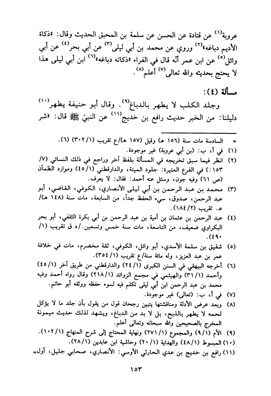 عرُوبَة عَن قَتَادَة عَن الْحسن عَن سَلمَة بن المحبق الحَدِيث وَقَالَ: " ذَكَاة الْأَدِيم دباغه " وَرُوِيَ عَن مُحَمَّد بن أبي ليلى عَن أبي بَحر عَن أبي وَائِل عَن ابْن عمر أَنه قَالَ فِي الْفراء " ذَكَاته دباغه " ابْن أبي ليلى هَذَا لَا يحْتَج بحَديثه وَالله تَعَالَى أعلم.